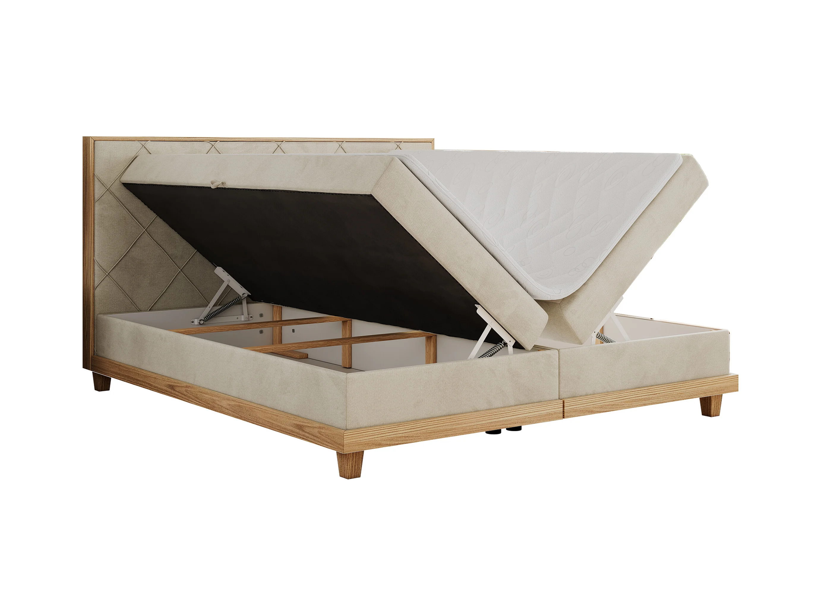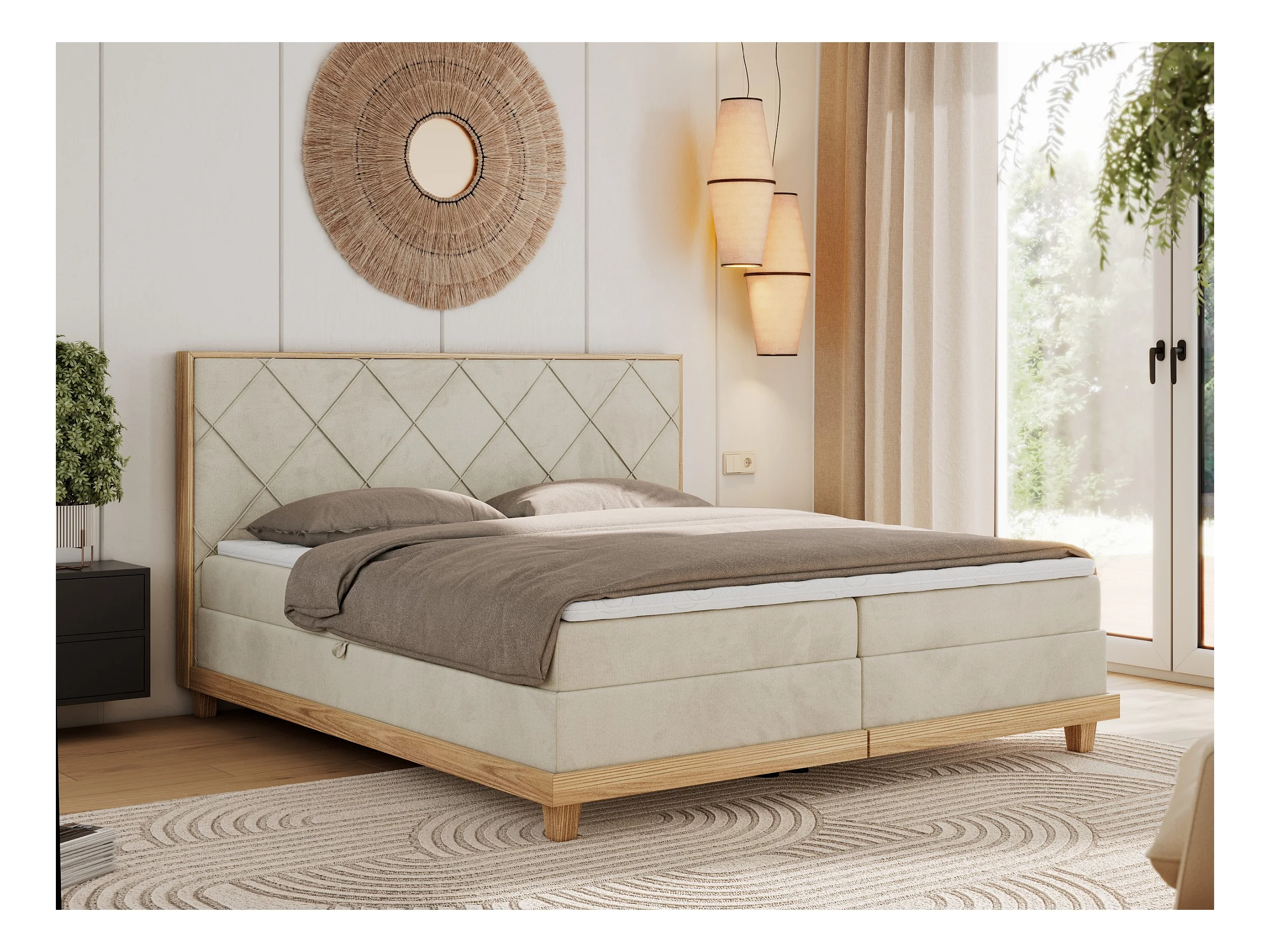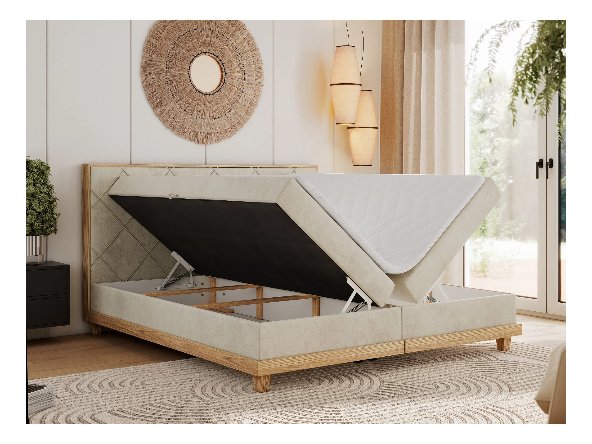 Boxspringbett CAICOS - mit gestepptem Kopfteil, Multipocket-Matratze und Topper, Holzelementen - 140x200 cm - H3 - Beige Velvet