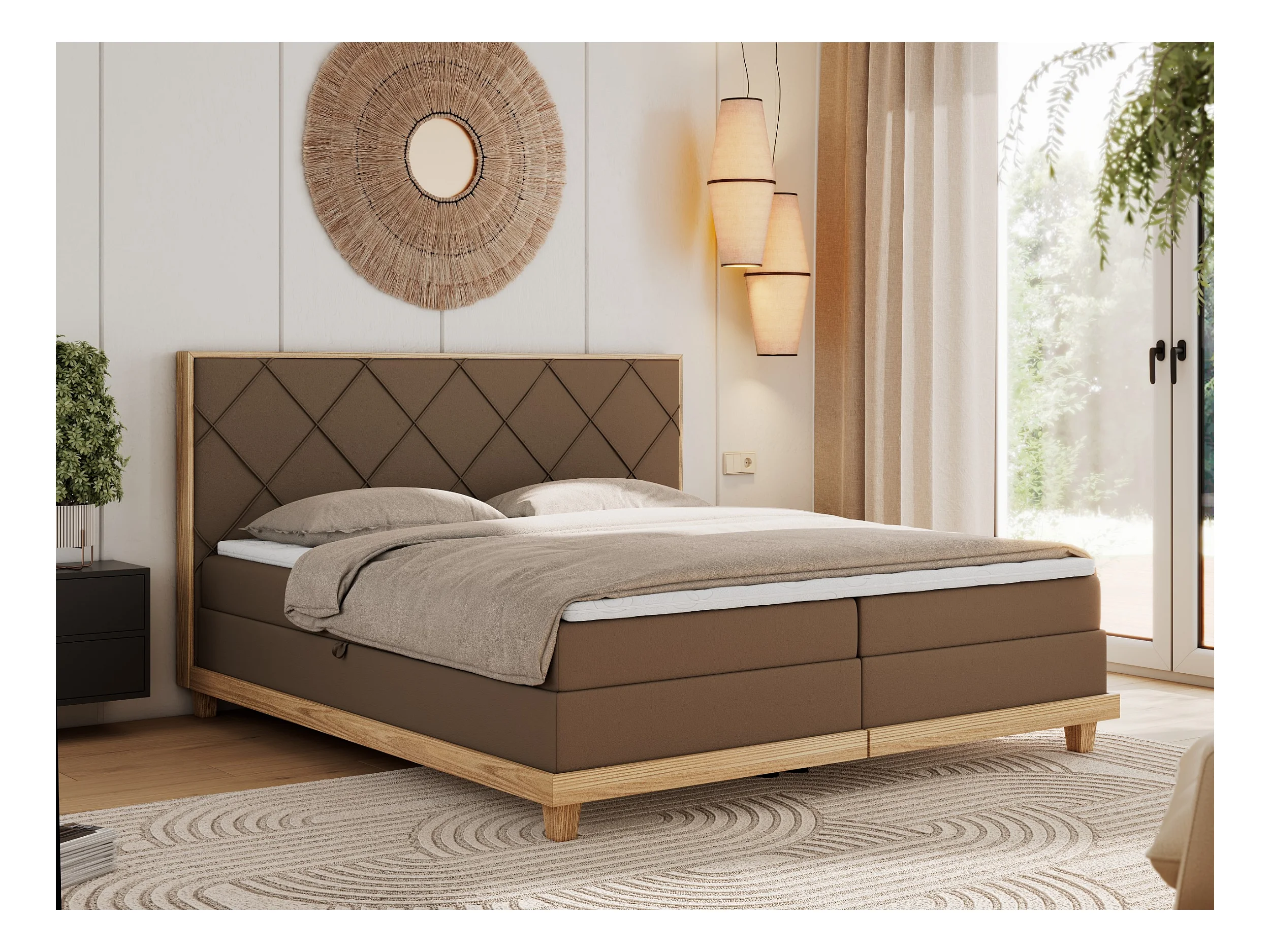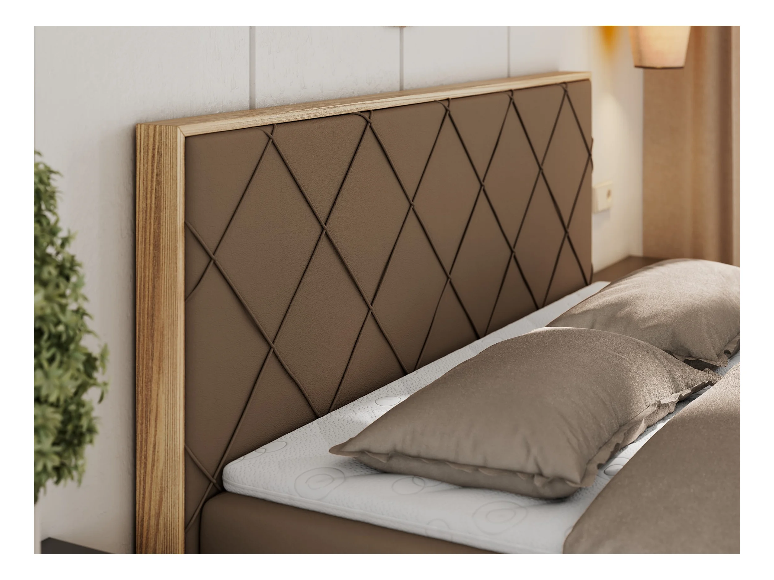 Boxspringbett CAICOS - mit gestepptem Kopfteil, Multipocket-Matratze und Topper, Holzelementen - 140x200 cm - H3 - Braun Kunstleder