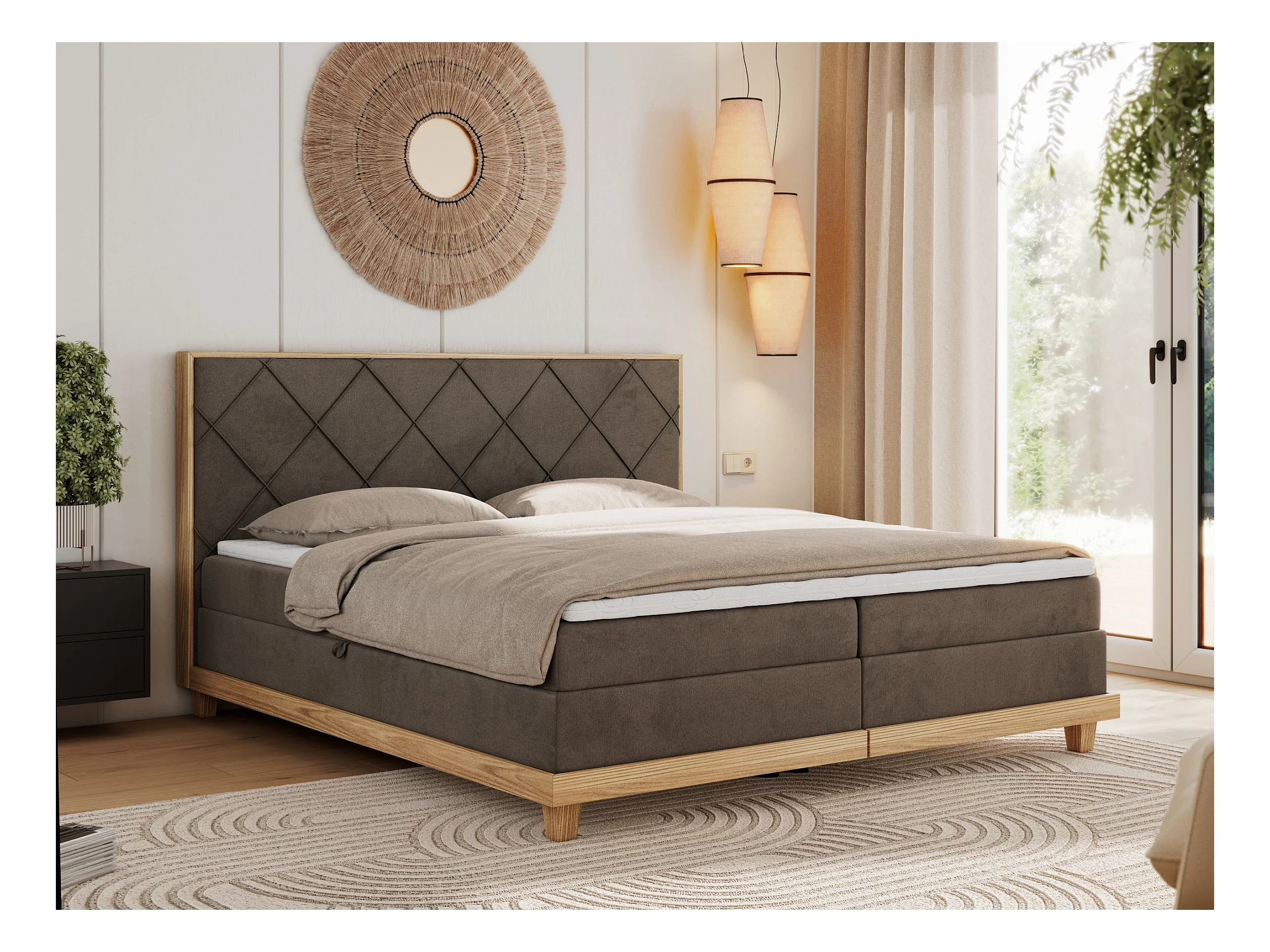 Boxspringbett CAICOS - mit gestepptem Kopfteil, Multipocket-Matratze und Topper, Holzelementen - 140x200 cm - H3 - Braun Velvet