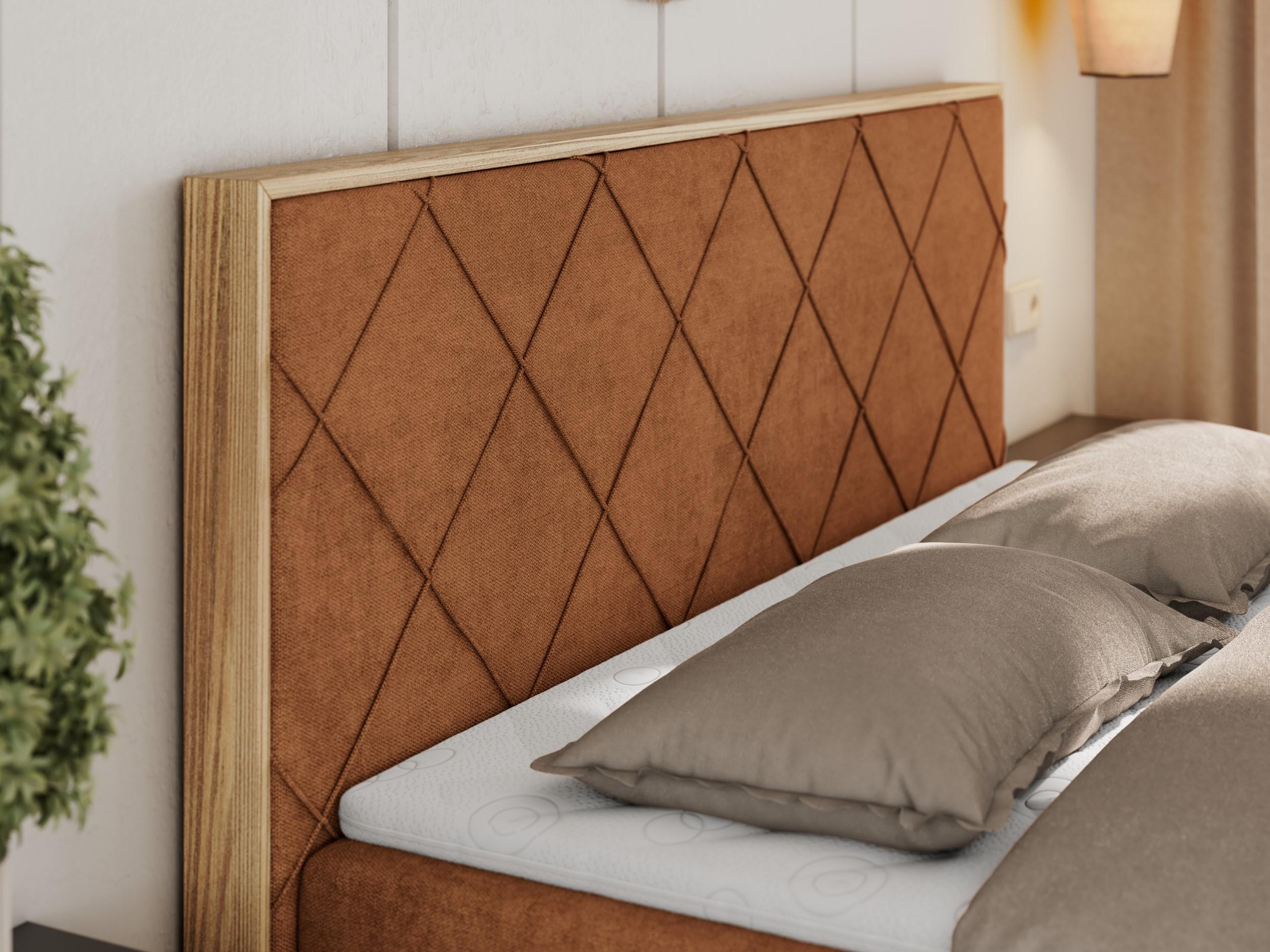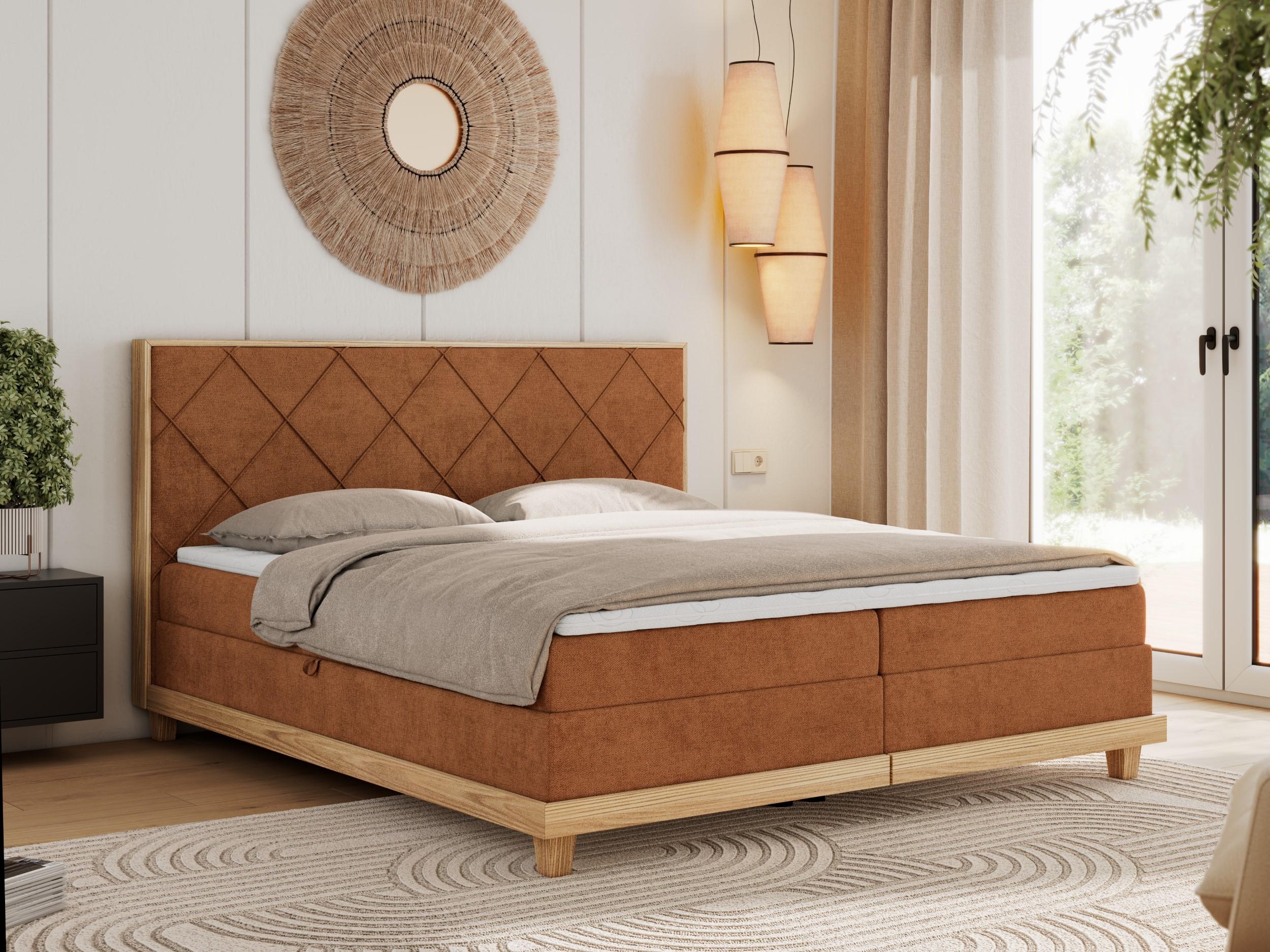 Boxspringbett CAICOS - mit gestepptem Kopfteil, Multipocket-Matratze und Topper, Holzelementen - 160x200 cm - H3 - Orange Strukture