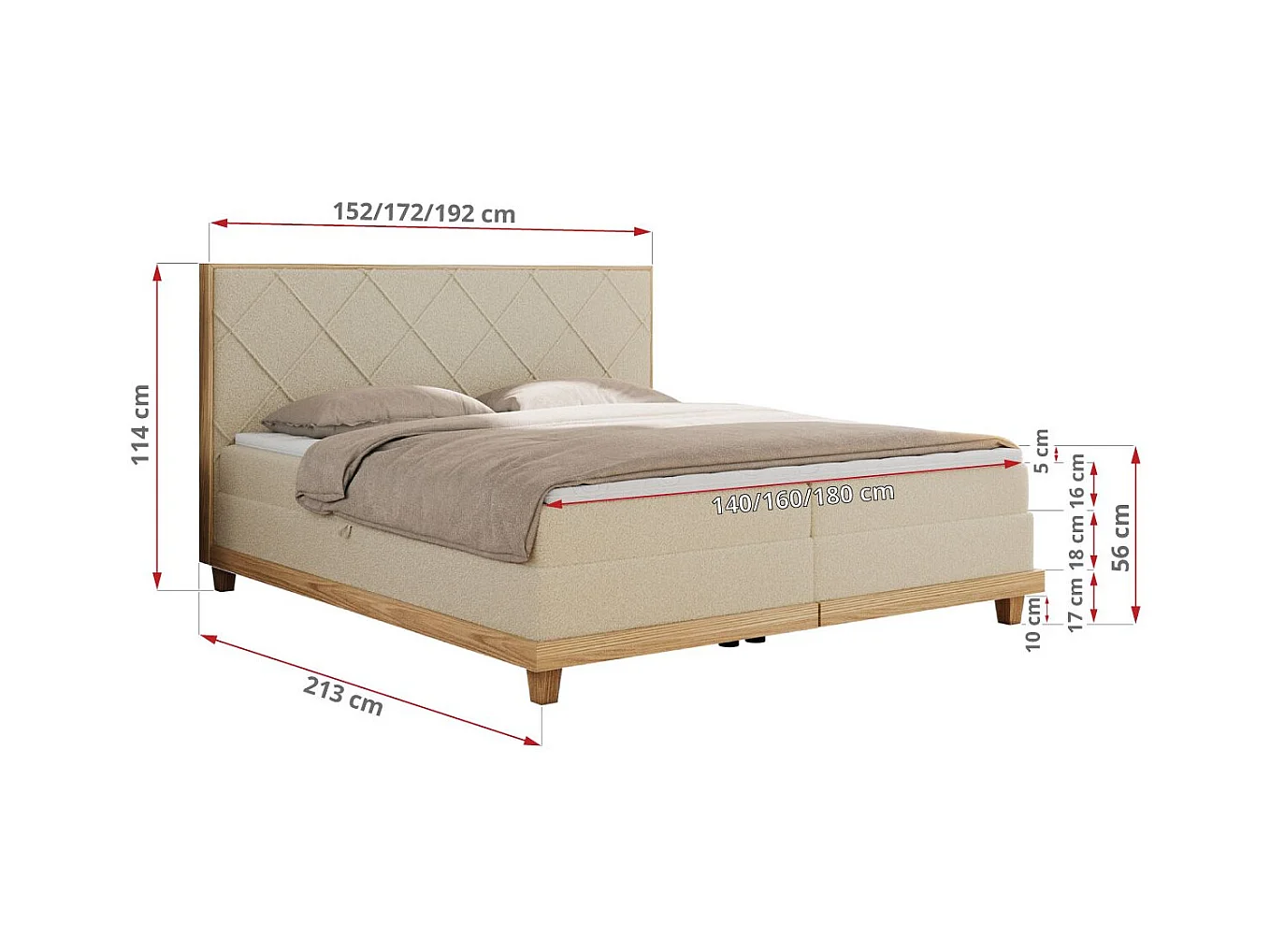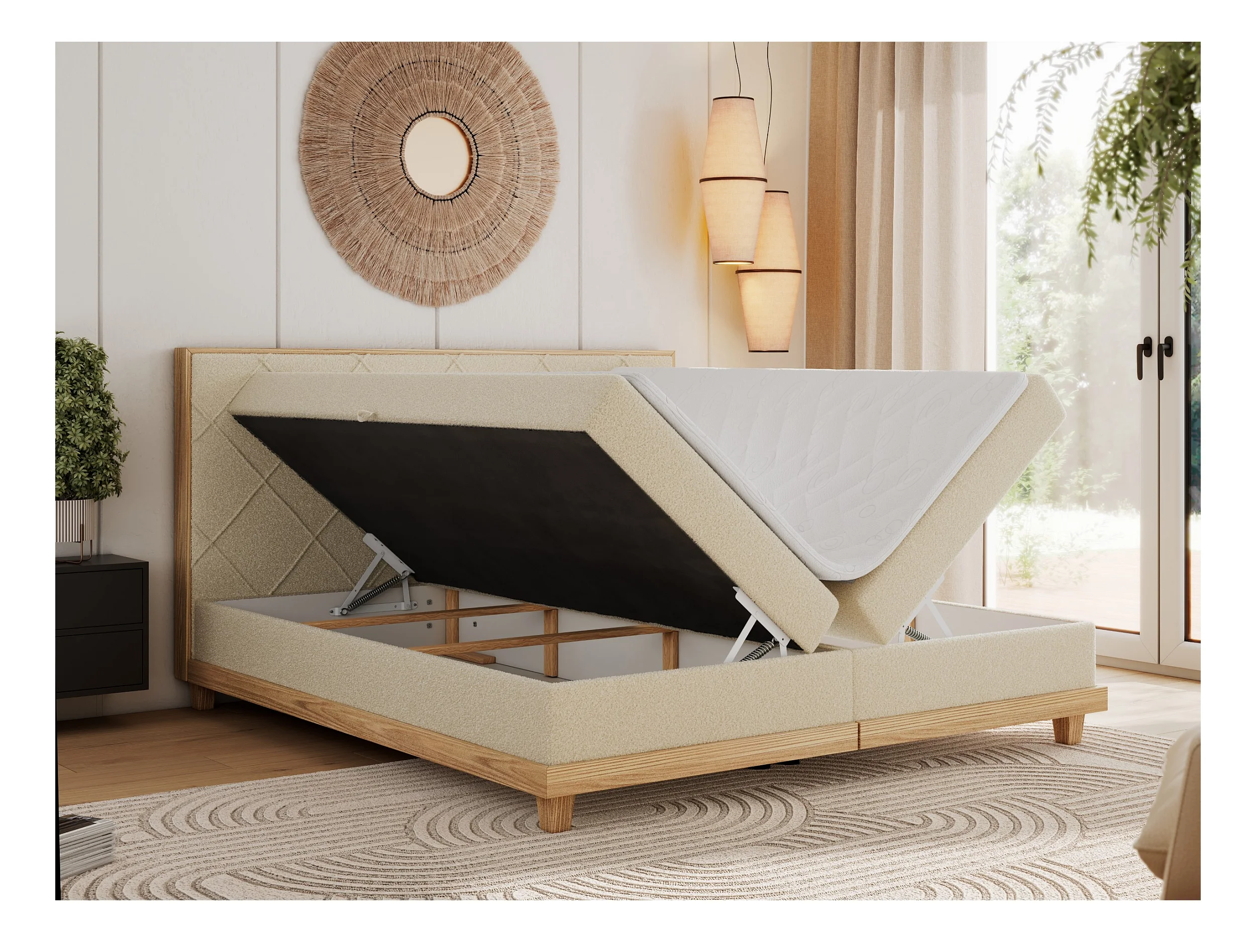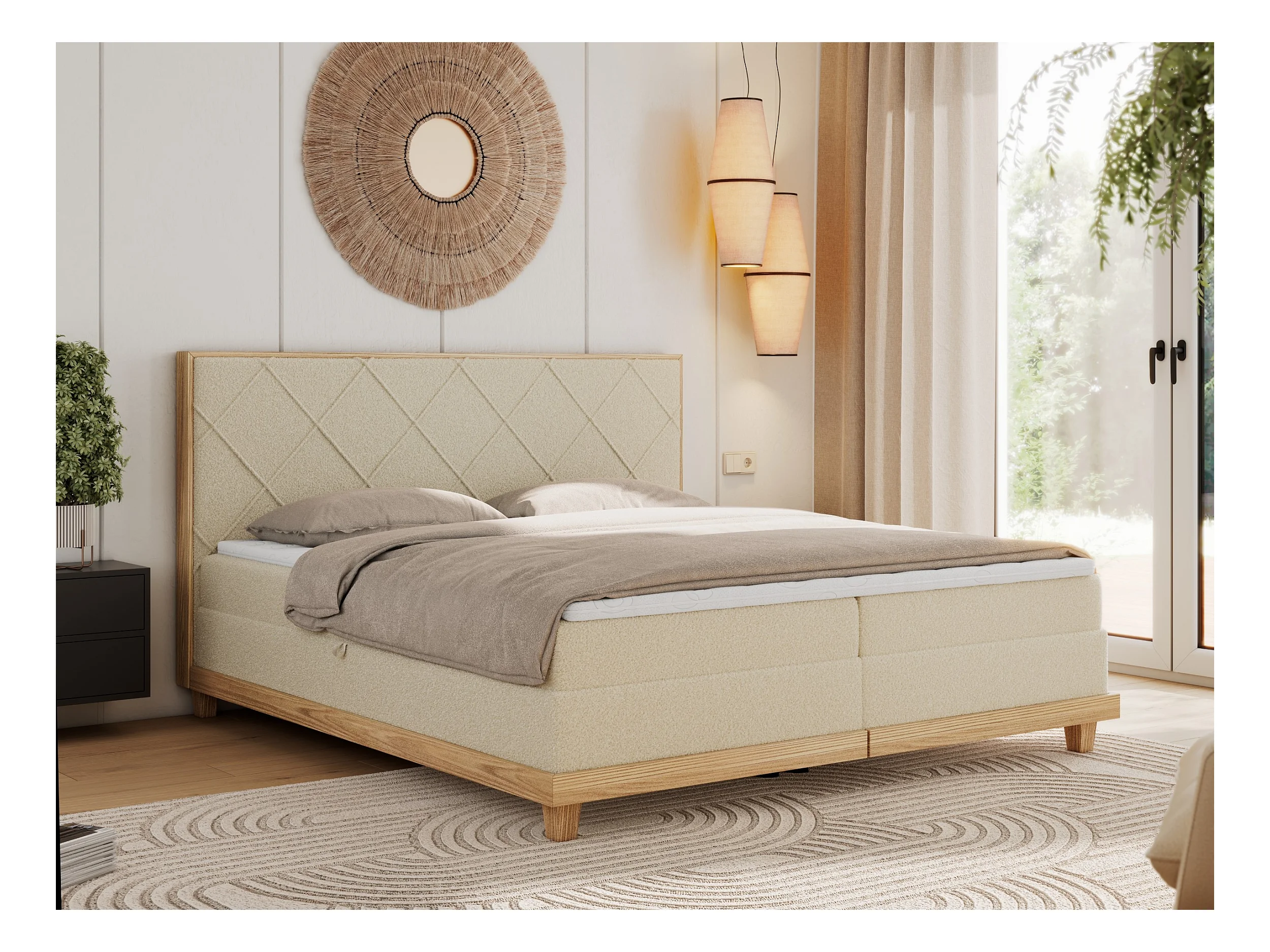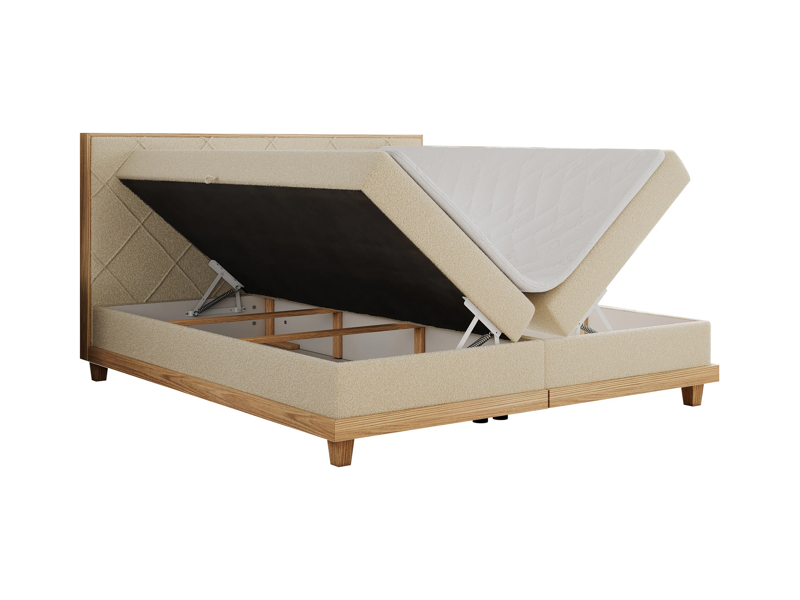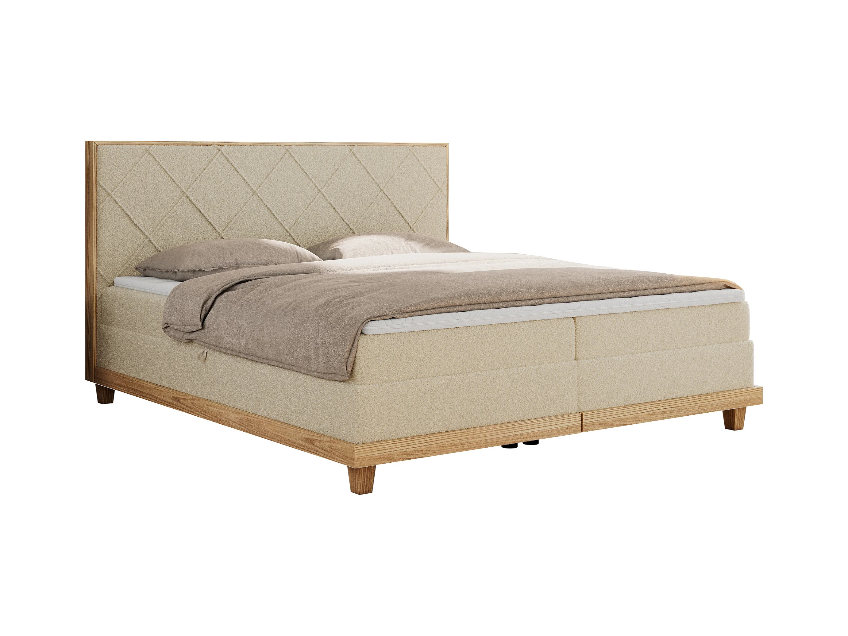 Boxspringbett CAICOS - mit gestepptem Kopfteil, Multipocket-Matratze und Topper, Holzelementen - 180x200 cm - H3 - Beige Boucle