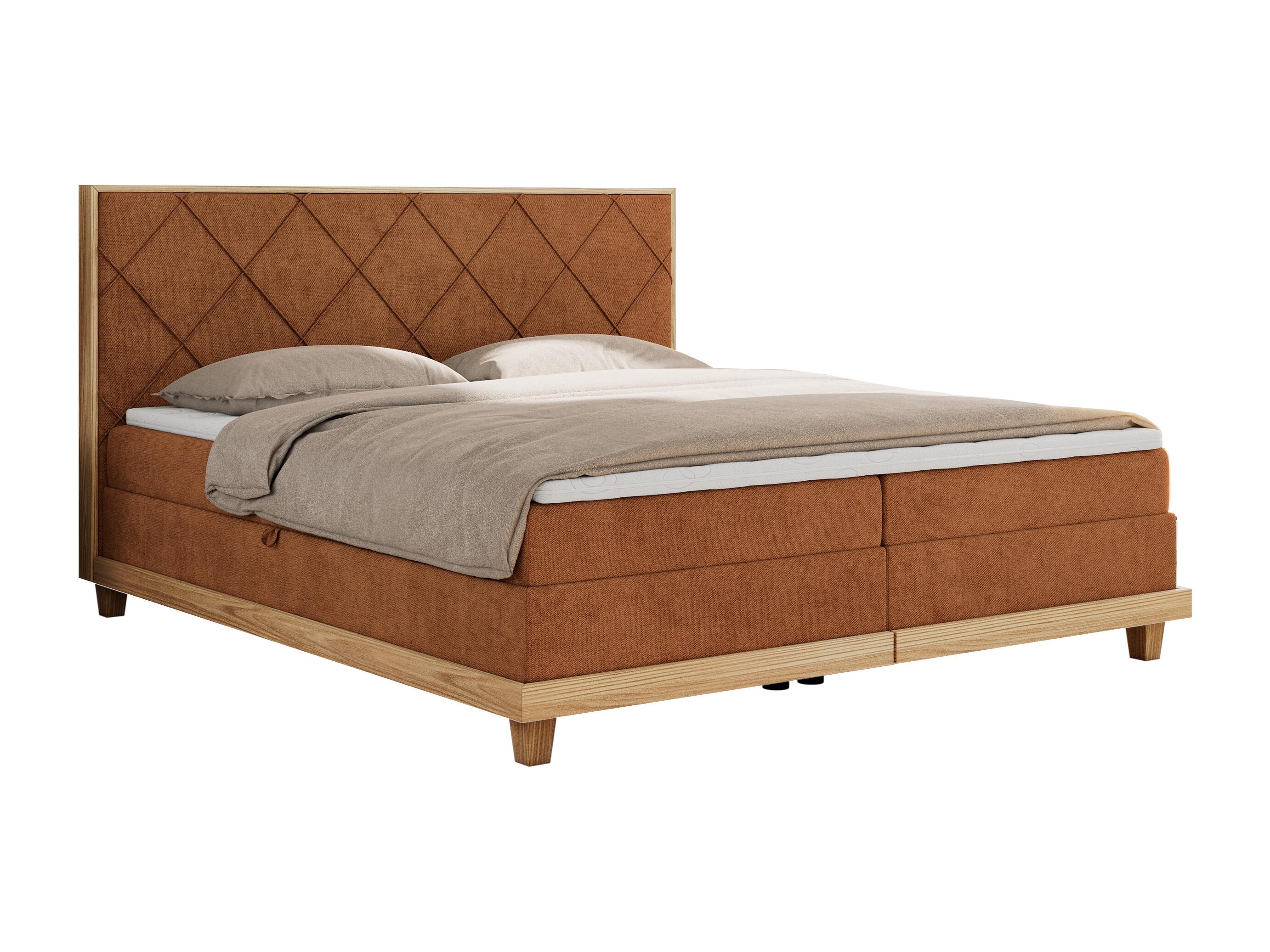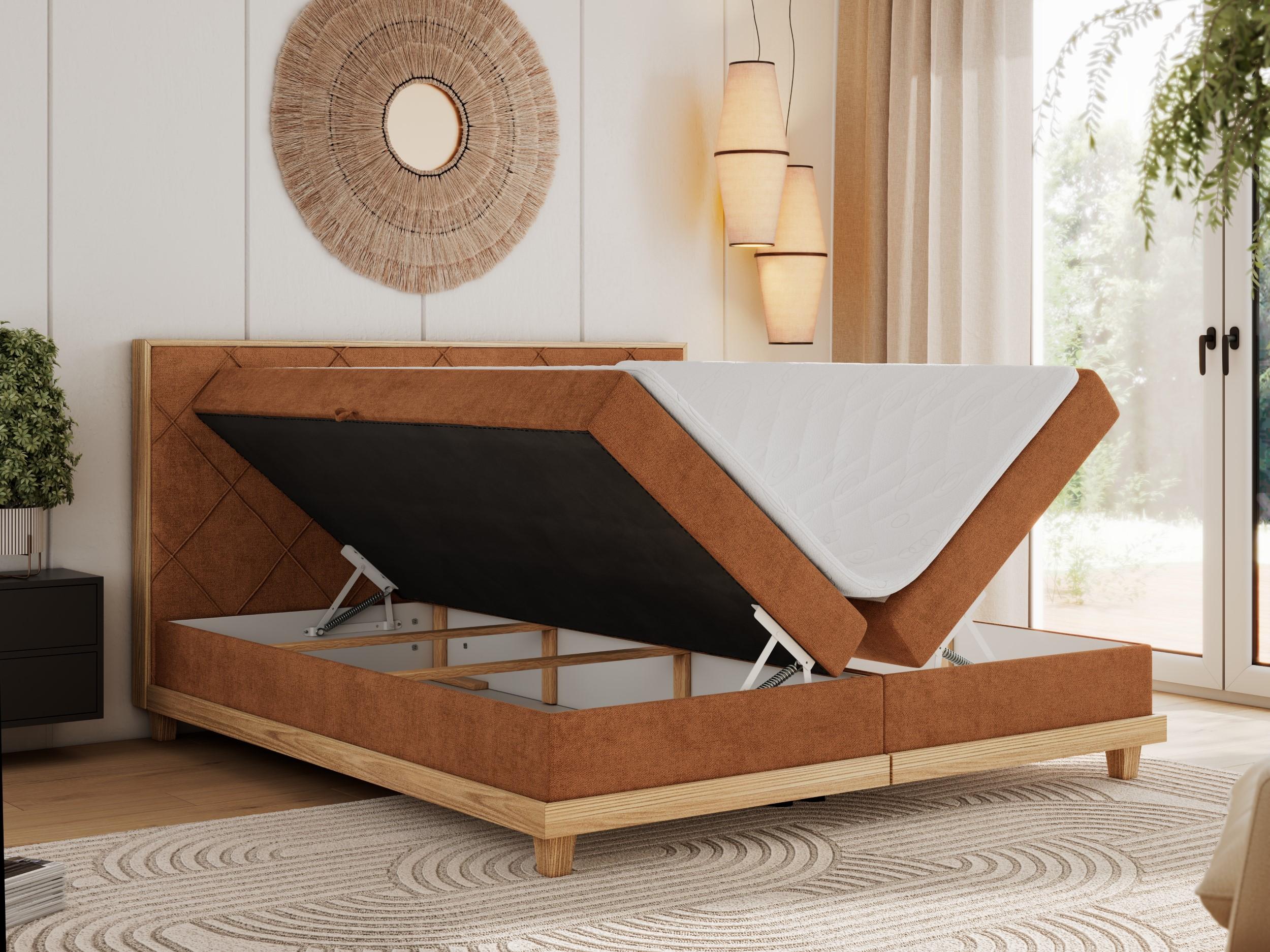 Boxspringbett CAICOS - mit gestepptem Kopfteil, Multipocket-Matratze und Topper, Holzelementen - 180x200 cm - H3 - Orange Strukture
