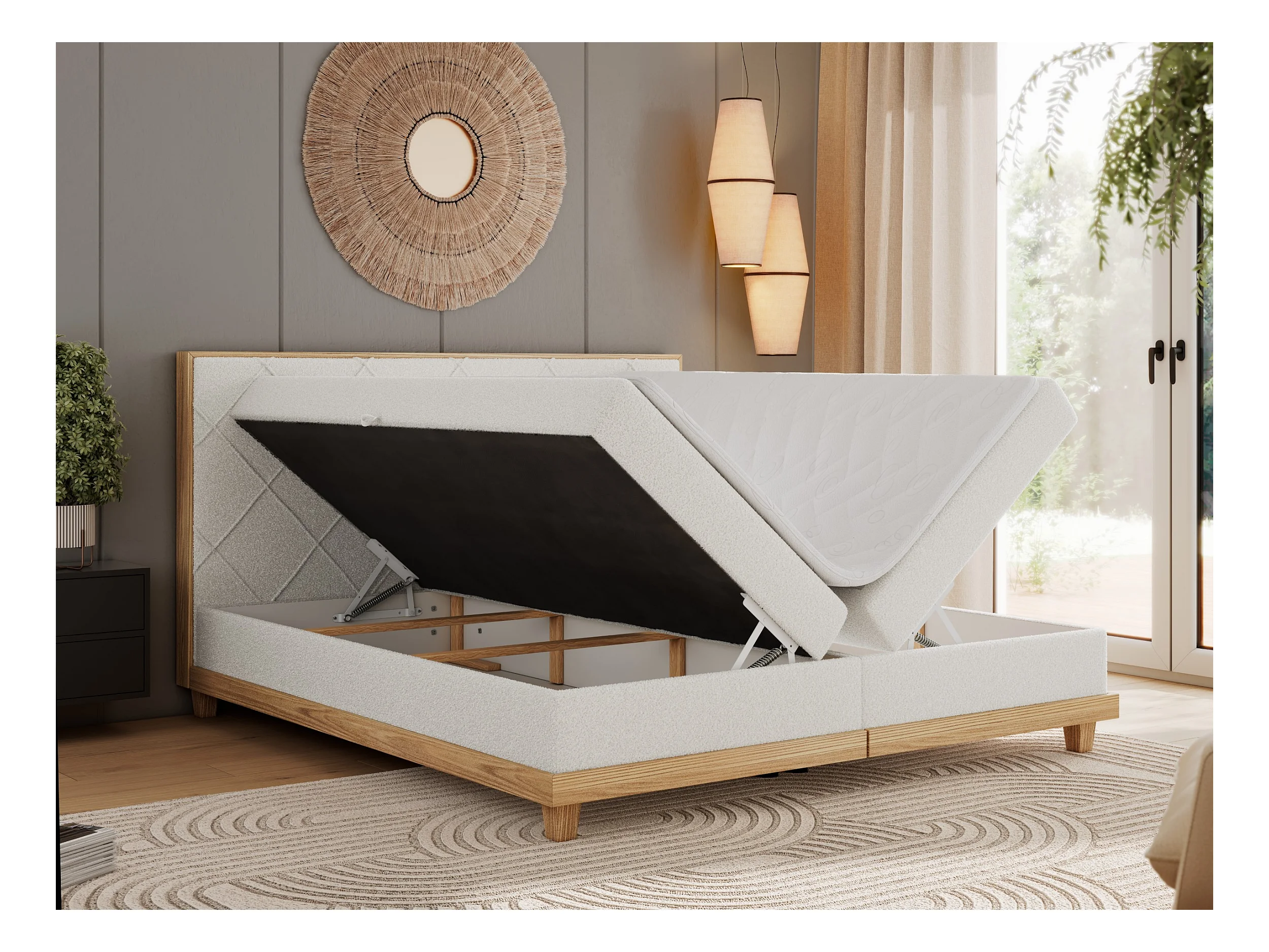 Boxspringbett CAICOS - mit gestepptem Kopfteil, Multipocket-Matratze und Topper, Holzelementen - 180x200 cm - H3 - Weiß Boucle