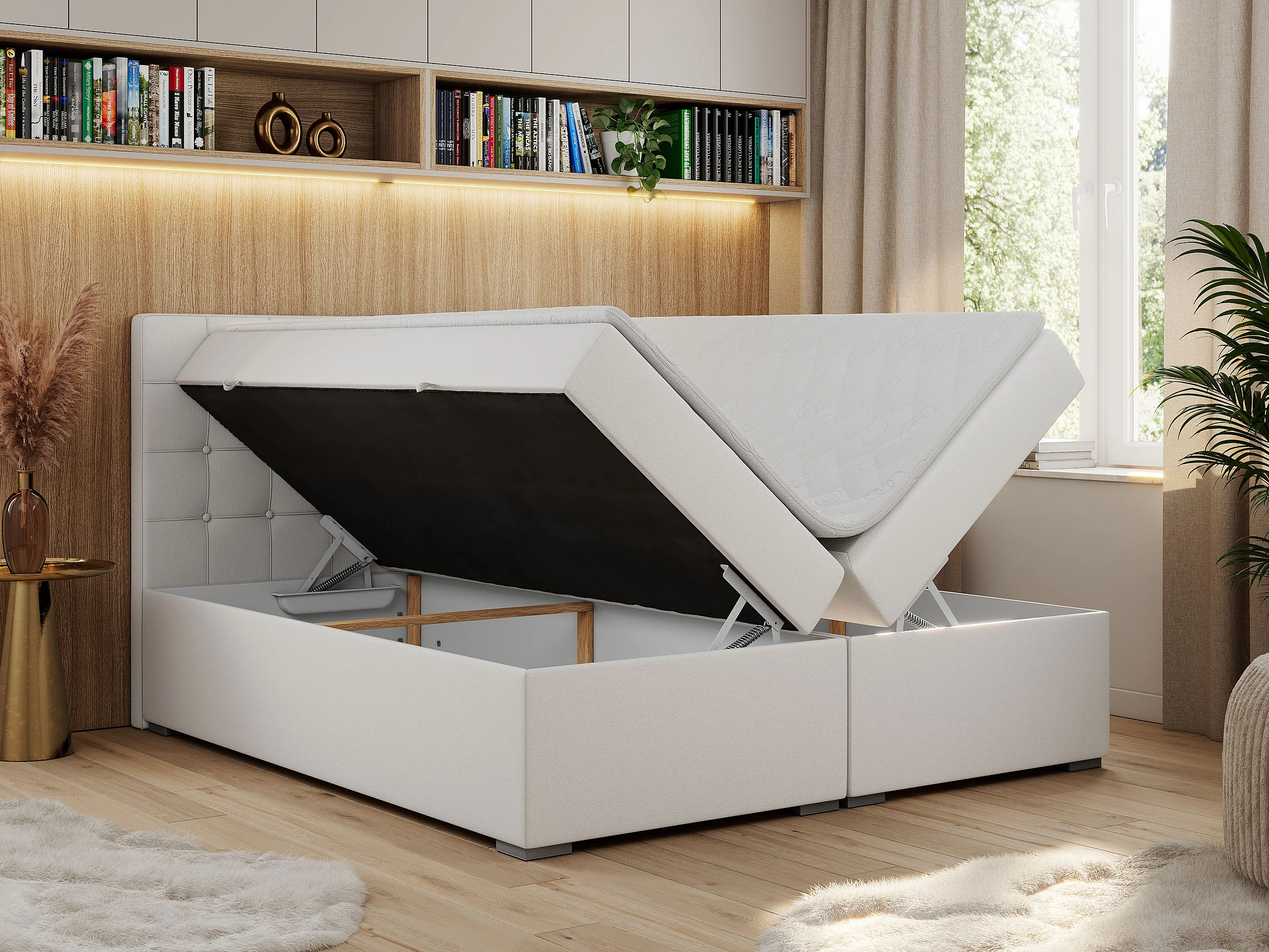 Boxspringbett CARMEN - Polsterbett mit zwei Bettkästen, gesteppte Kopfstütze, Multipocket-Matratze - 120x200 cm - H4 - Weiß Kunstleder
