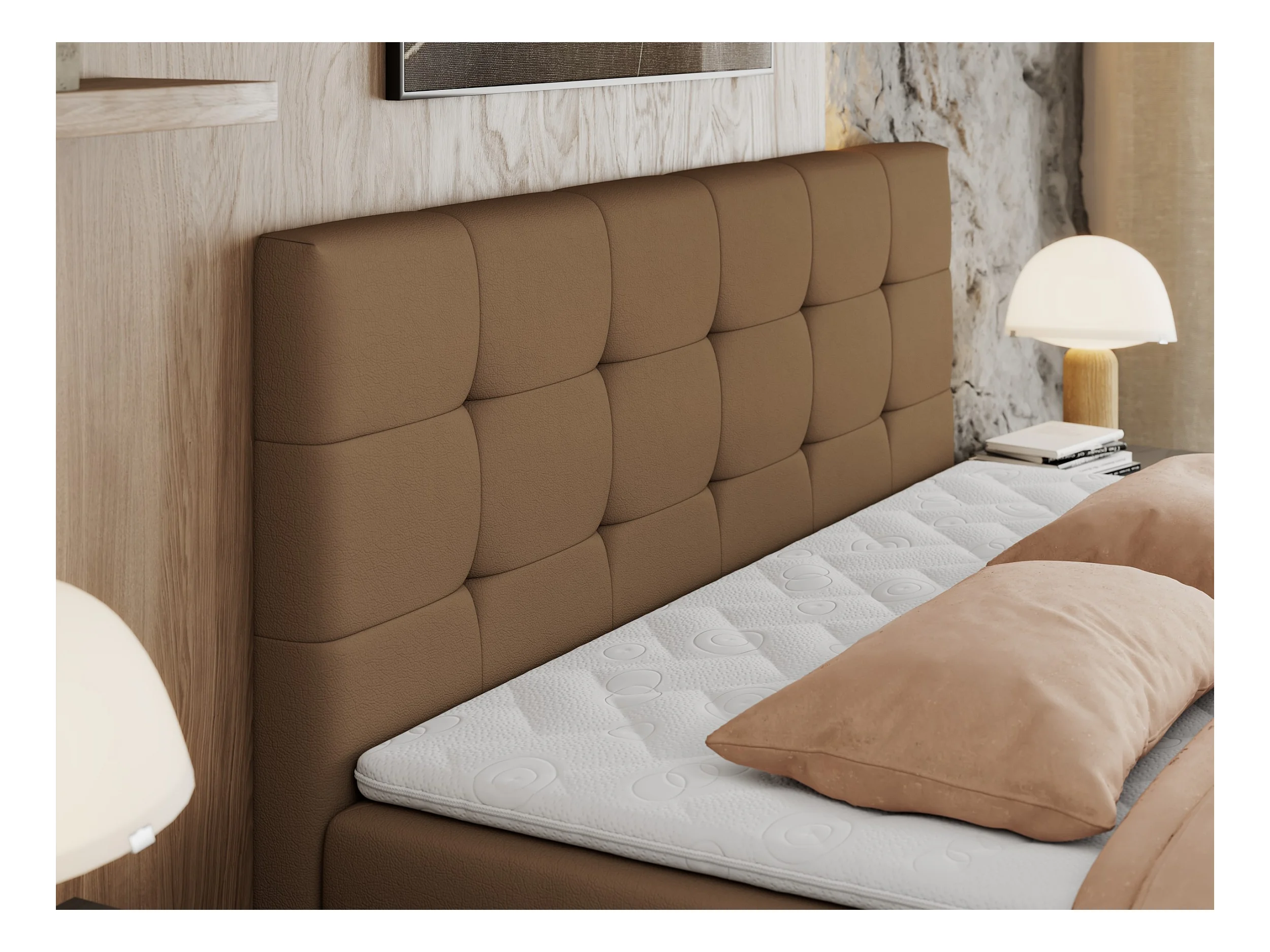 Boxspringbett CENTOS mit gestepptem Kopfteil, Multipocket-Matratze, Doppelbett mit Stauraum - 120x200 cm - H3 - Braun Kunstleder