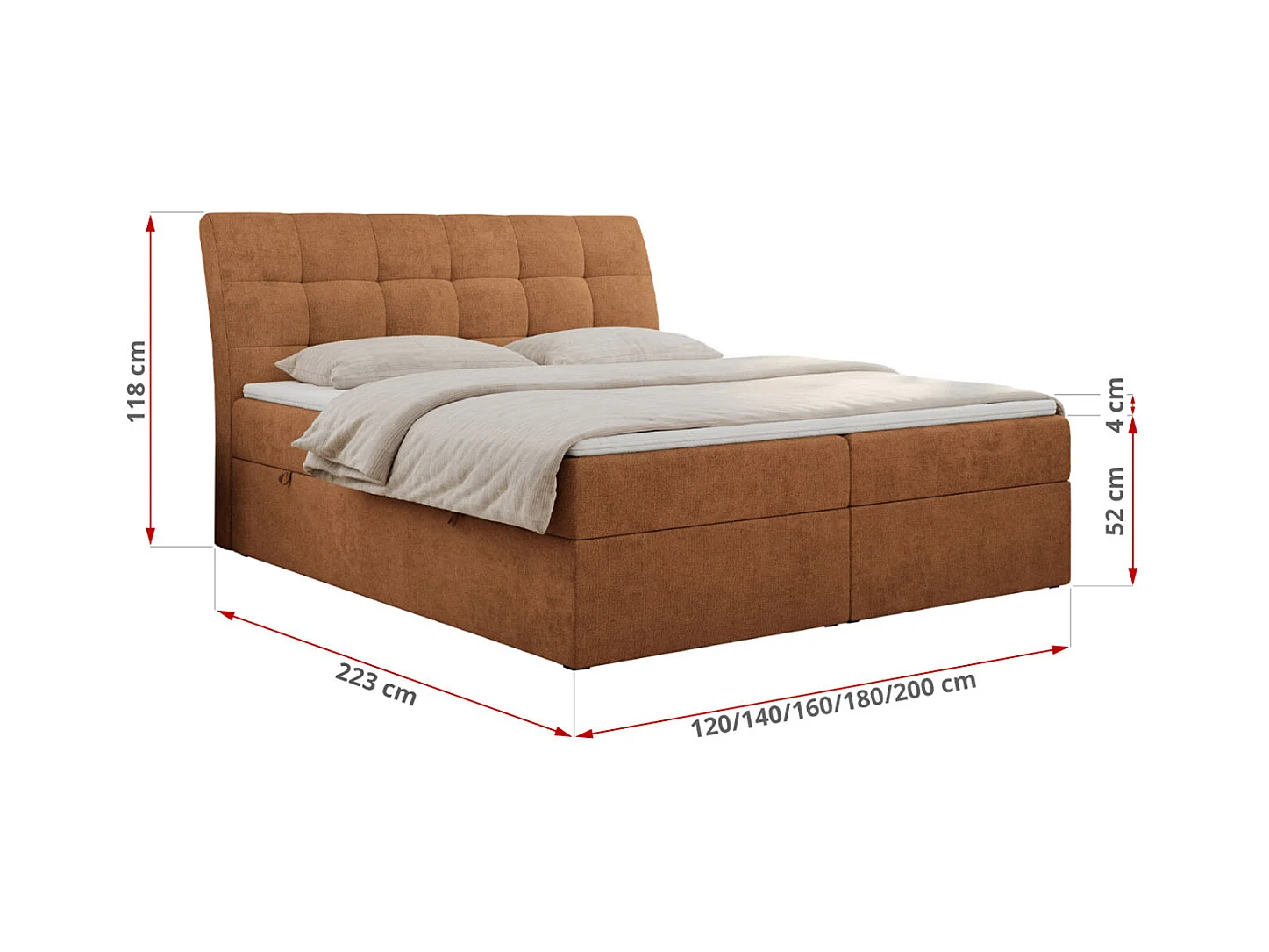 Boxspringbett DIEGOS mit Stauraum, gestepptem Kopfteil, Multipocket-Matratze - 140x200 cm - H3 - Orange Strukture