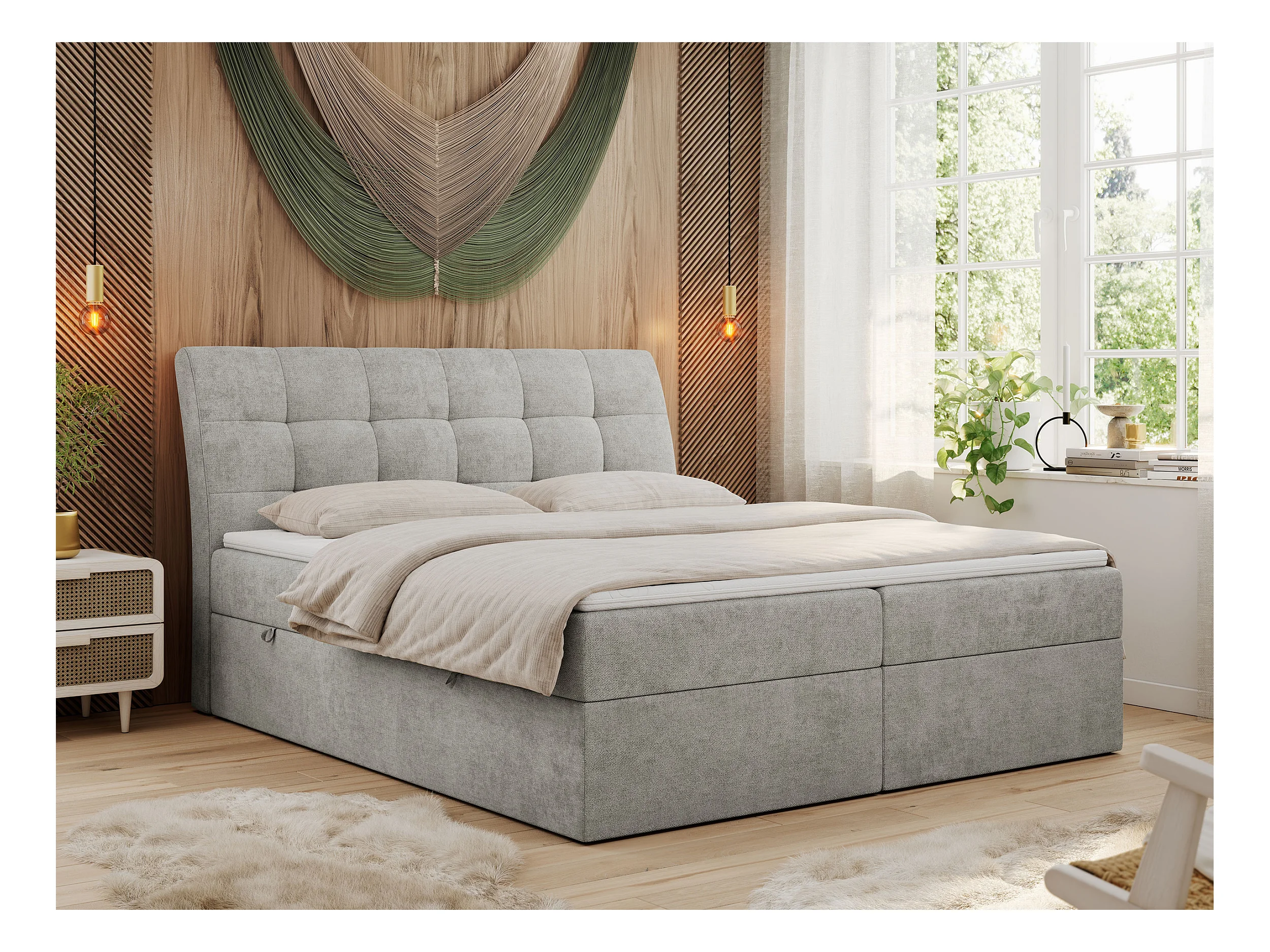 Boxspringbett DIEGOS mit Stauraum, gestepptem Kopfteil, Multipocket-Matratze - 200x200 cm - H4 - Hellgrau Strukture