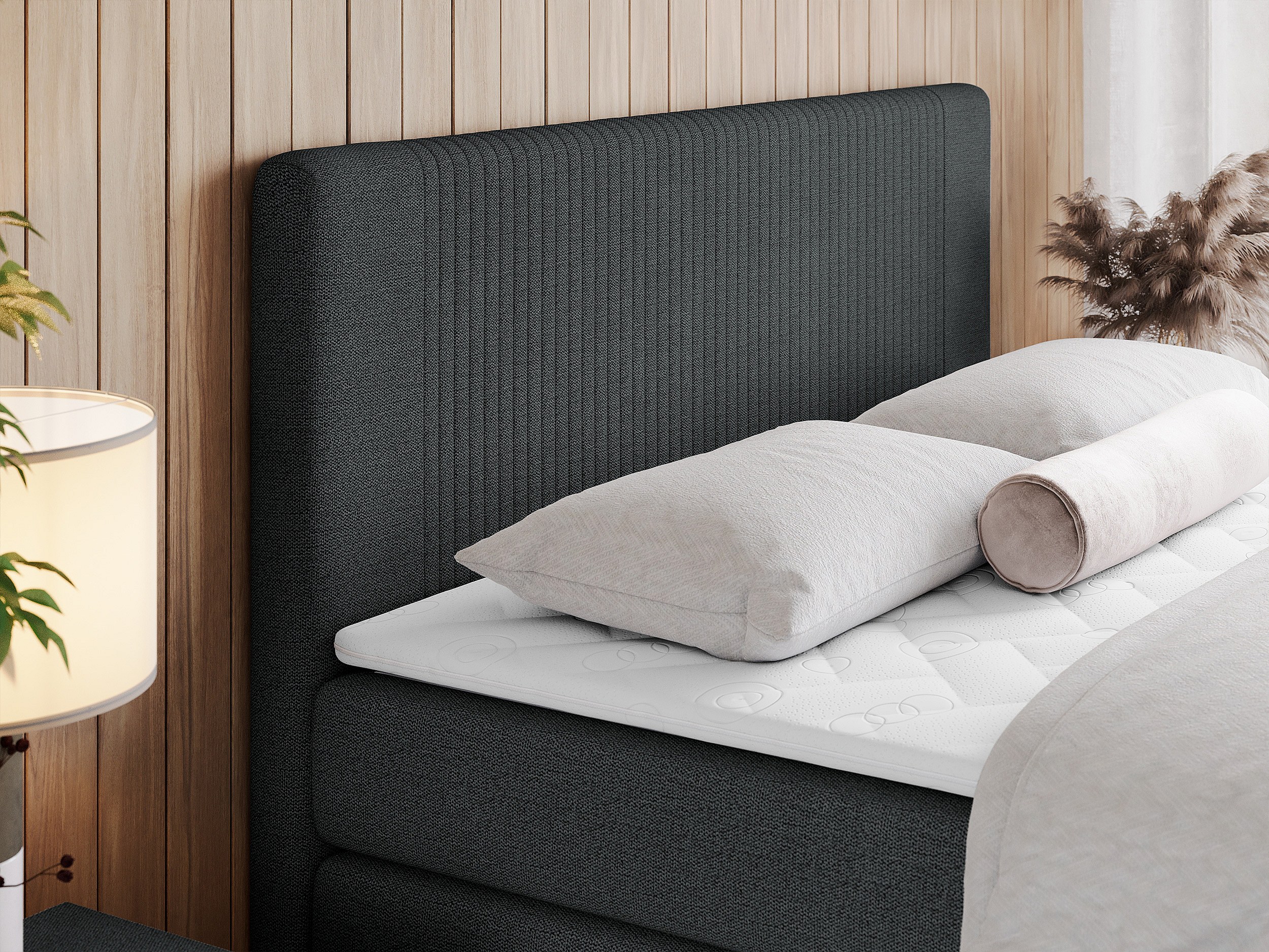 Boxspringbett DOREN KING - mit gesteppter Front und Kopfteil, zwei Multipocket-Matratzen und Topper, Doppelbett - 140x200 cm - H3 - Dunkelgrau Strukture