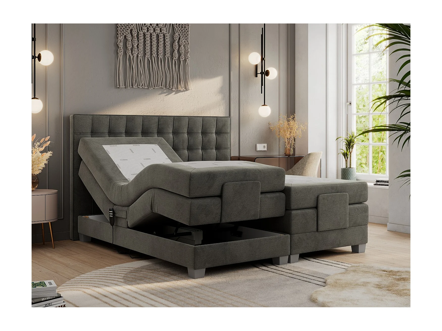 Boxspringbett ELEKTRO mit Multipocket-Matratze, Elektrisch verstellbare, genähtes Kopfteil - 140x200 cm - H3 - Dunkelgrau Velvet