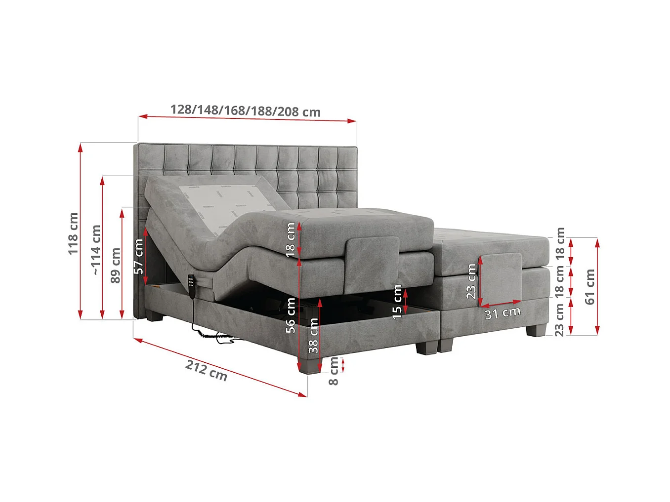 Boxspringbett ELEKTRO mit Multipocket-Matratze, Elektrisch verstellbare, genähtes Kopfteil - 140x200 cm - H3 - Hellgrau Velvet