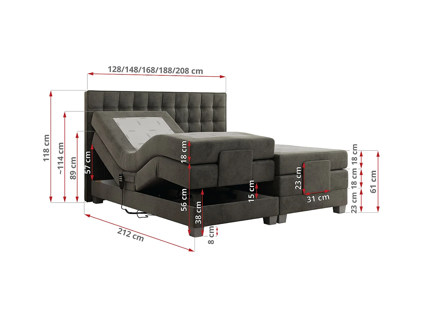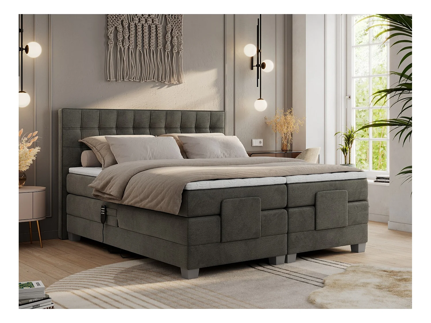 Boxspringbett ELEKTRO mit Multipocket-Matratze, Elektrisch verstellbare, genähtes Kopfteil - 160x200 cm - H3 - Dunkelgrau Velvet