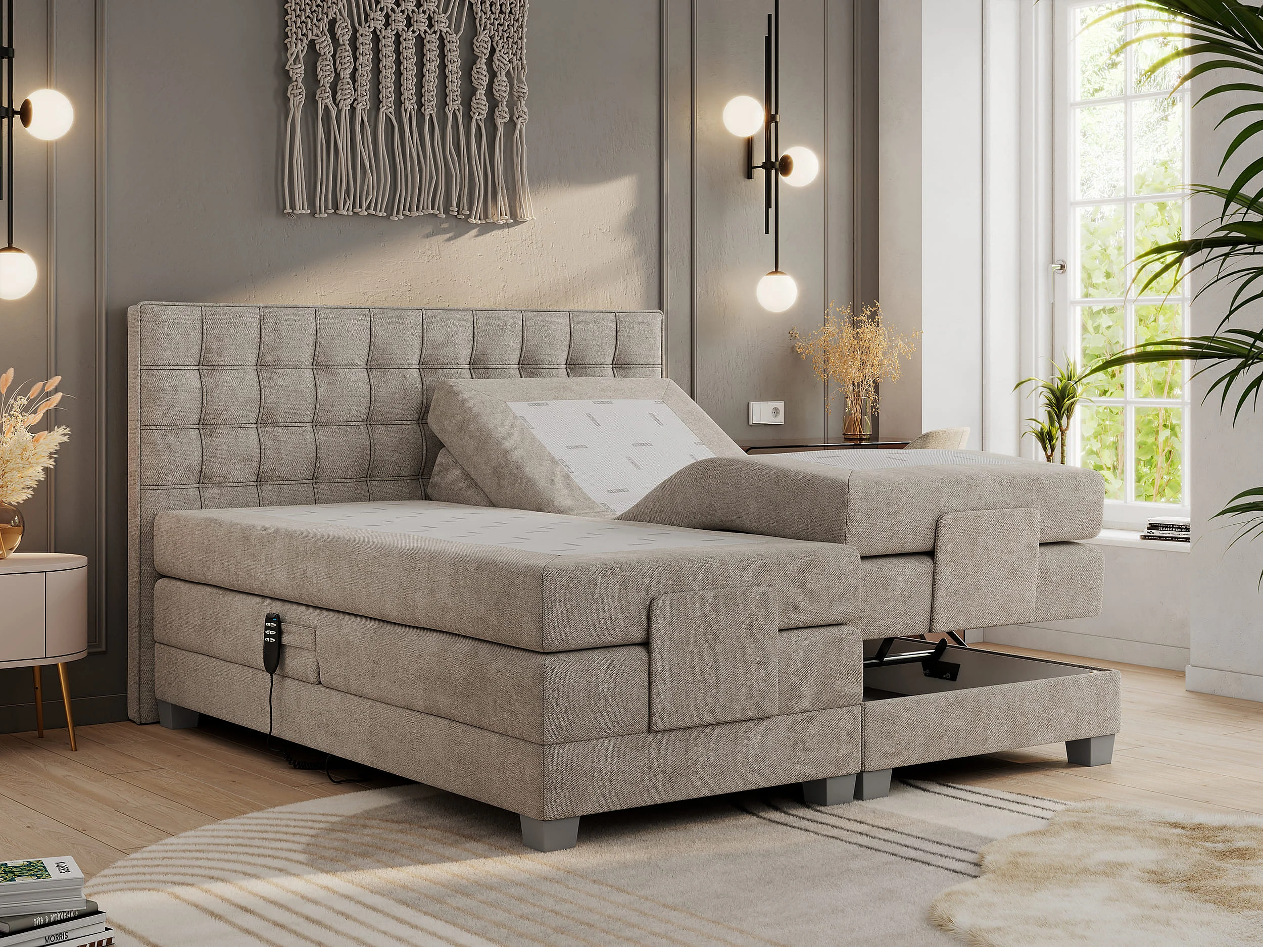 Boxspringbett ELEKTRO mit Multipocket-Matratze, Elektrisch verstellbare, genähtes Kopfteil - 180x200 cm - H3 - Beige Strukture