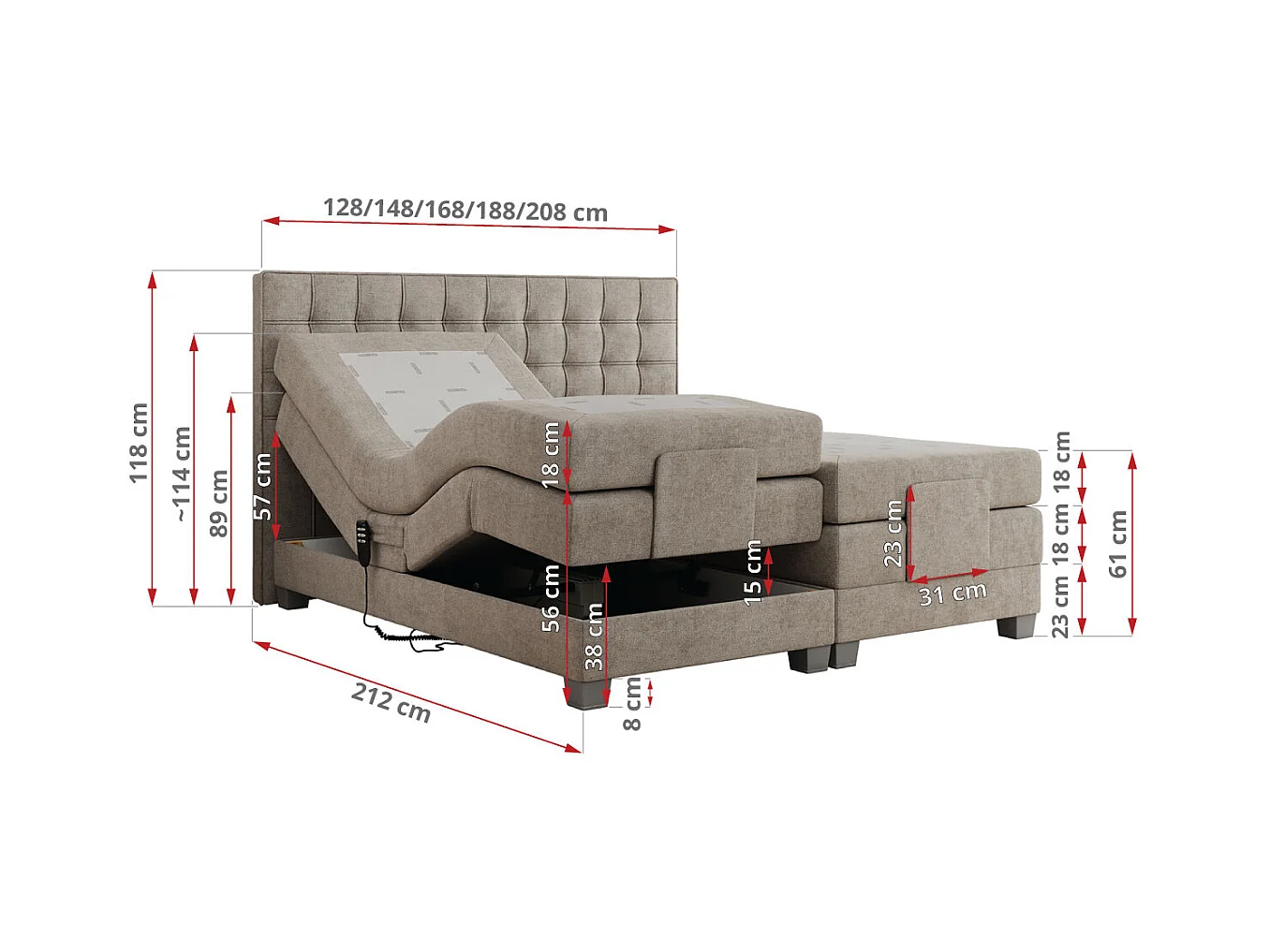 Boxspringbett ELEKTRO mit Multipocket-Matratze, Elektrisch verstellbare, genähtes Kopfteil - 200x200 cm - H3 - Beige Strukture