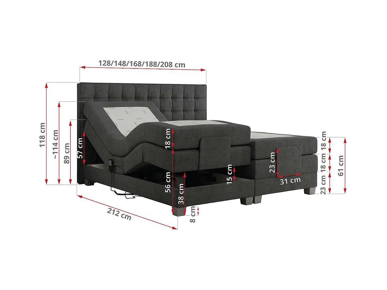 Boxspringbett ELEKTRO mit Multipocket-Matratze, Elektrisch verstellbare, genähtes Kopfteil - 200x200 cm - H3 - Dunkelgrau Strukture