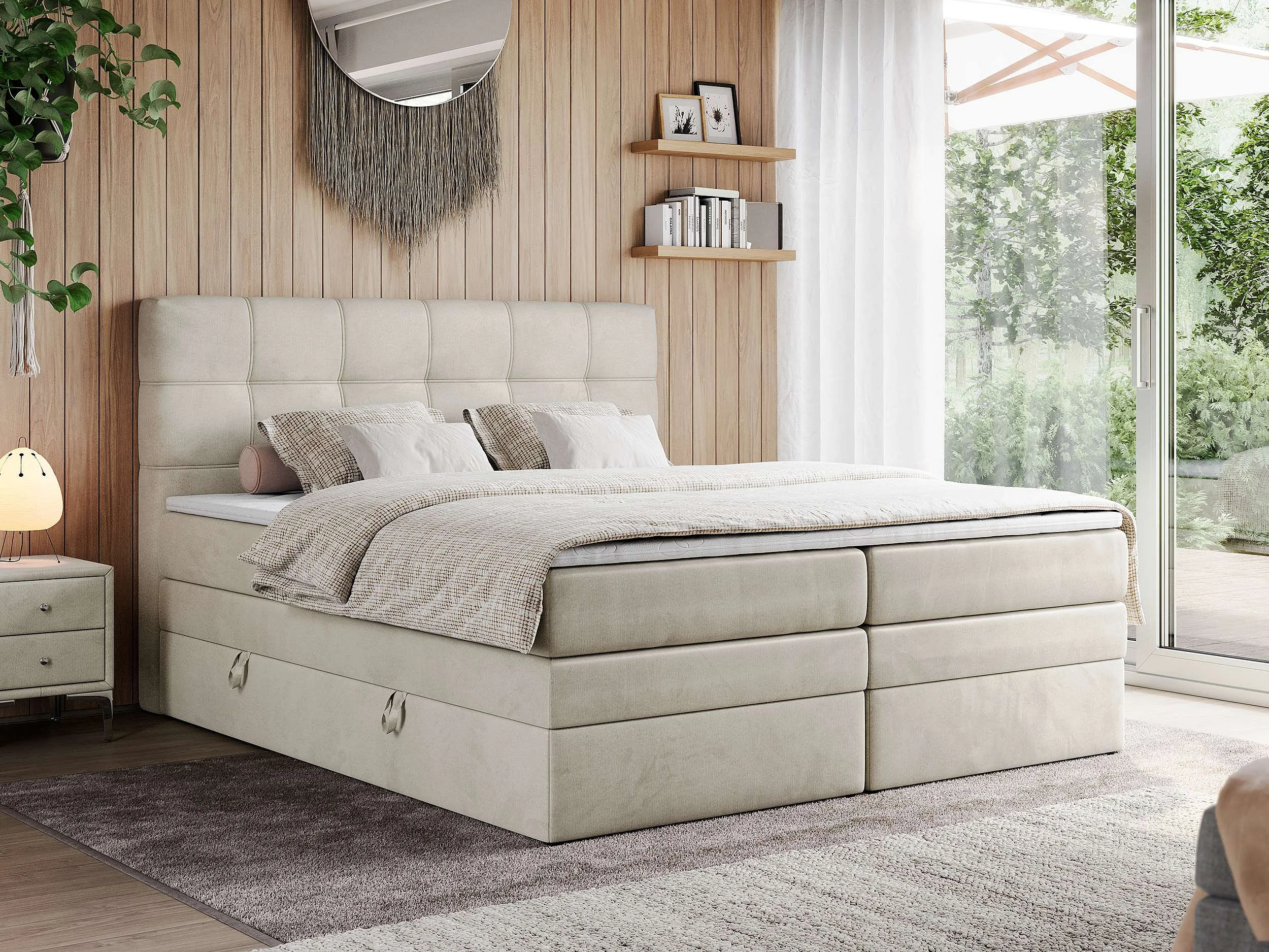 Boxspringbett ERNI KING, gestepptes Kopfteil, zwei Multipocket-Matratze und Topper, mit Stauraum - 120x200 cm - H3 - Beige Velvet