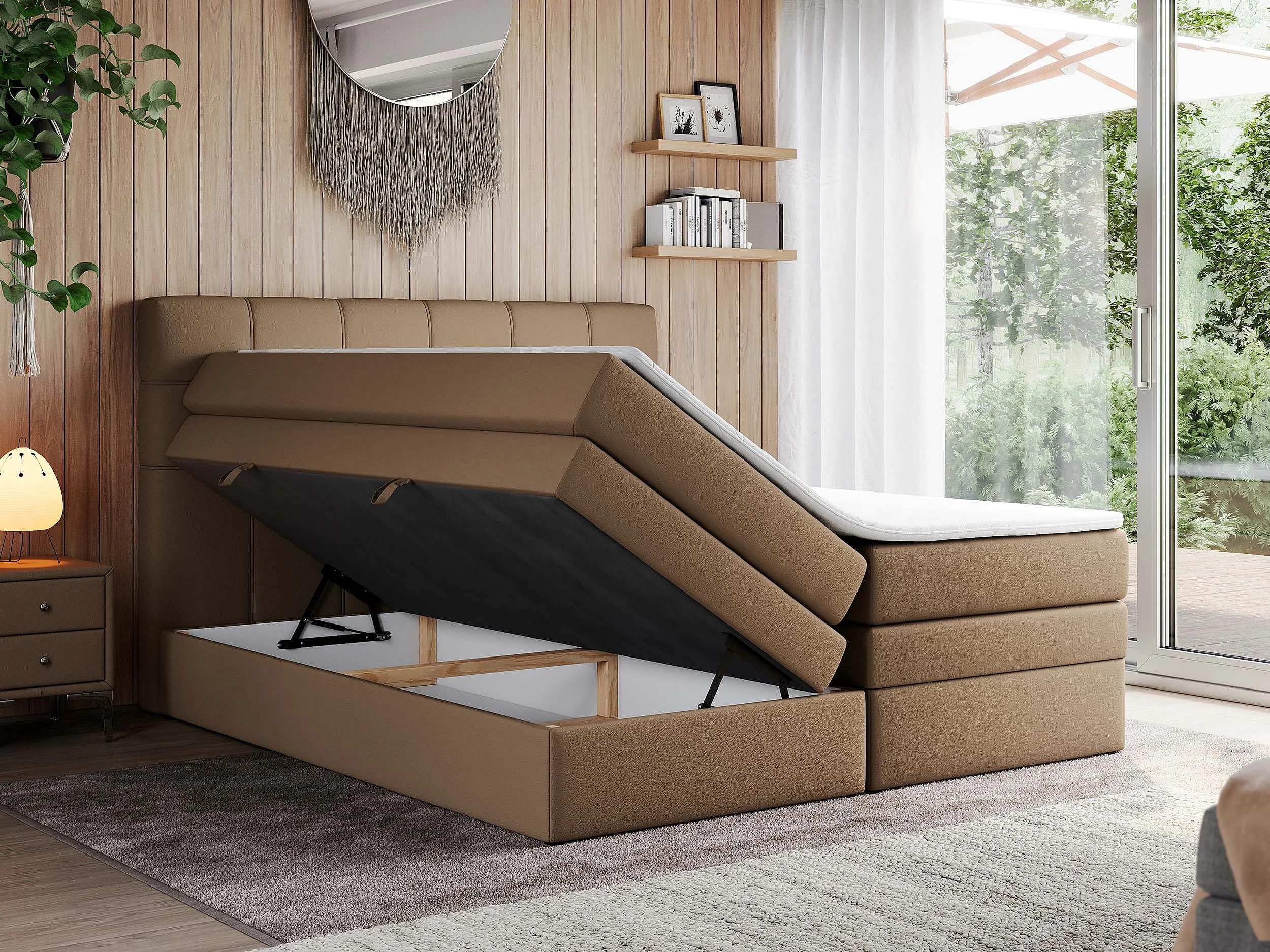 Boxspringbett ERNI KING, gestepptes Kopfteil, zwei Multipocket-Matratze und Topper, mit Stauraum - 140x200 cm - H3 - Braun Kunstleder