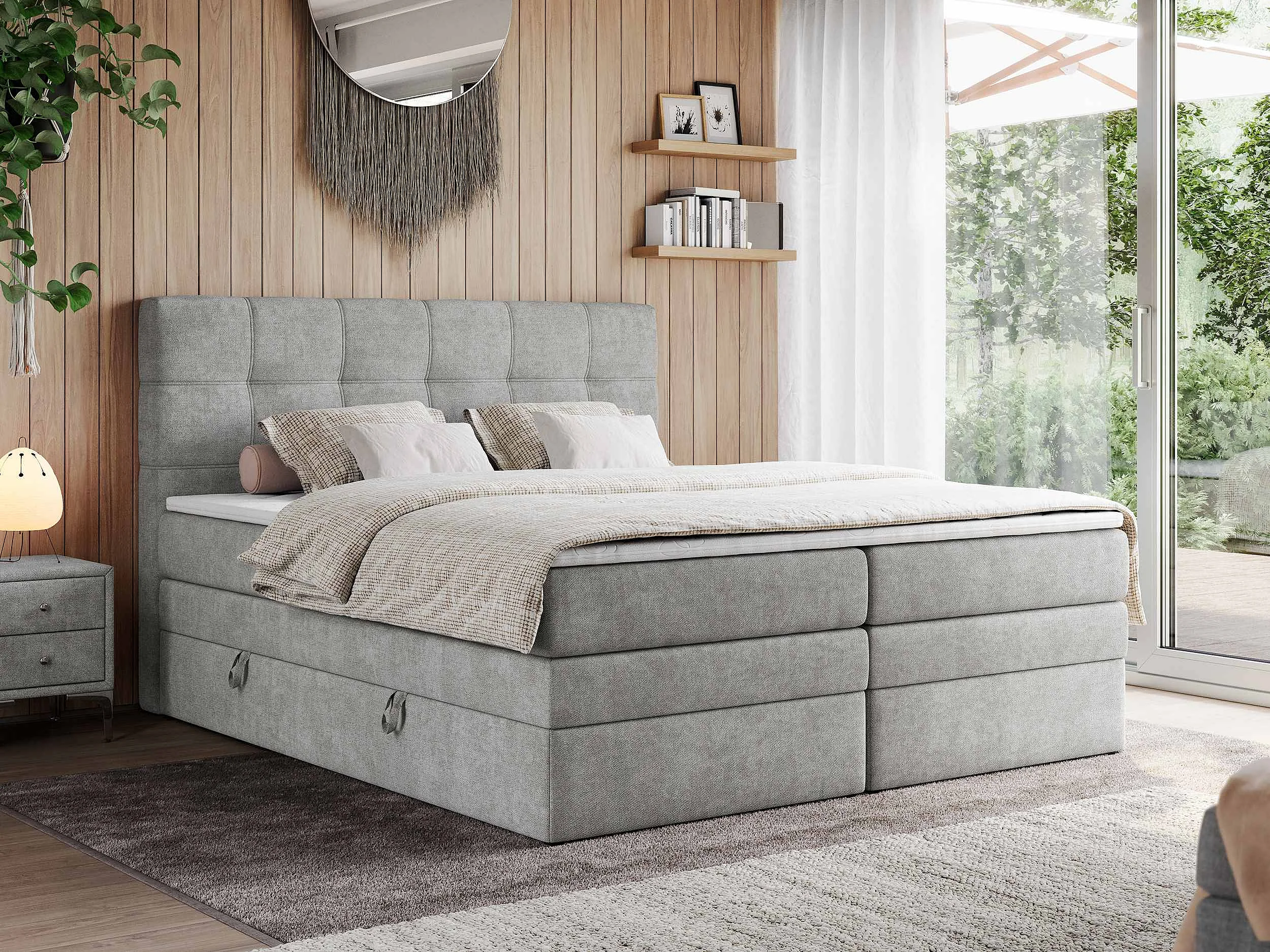 Boxspringbett ERNI KING, gestepptes Kopfteil, zwei Multipocket-Matratze und Topper, mit Stauraum - 140x200 cm - H3 - Hellgrau Strukture