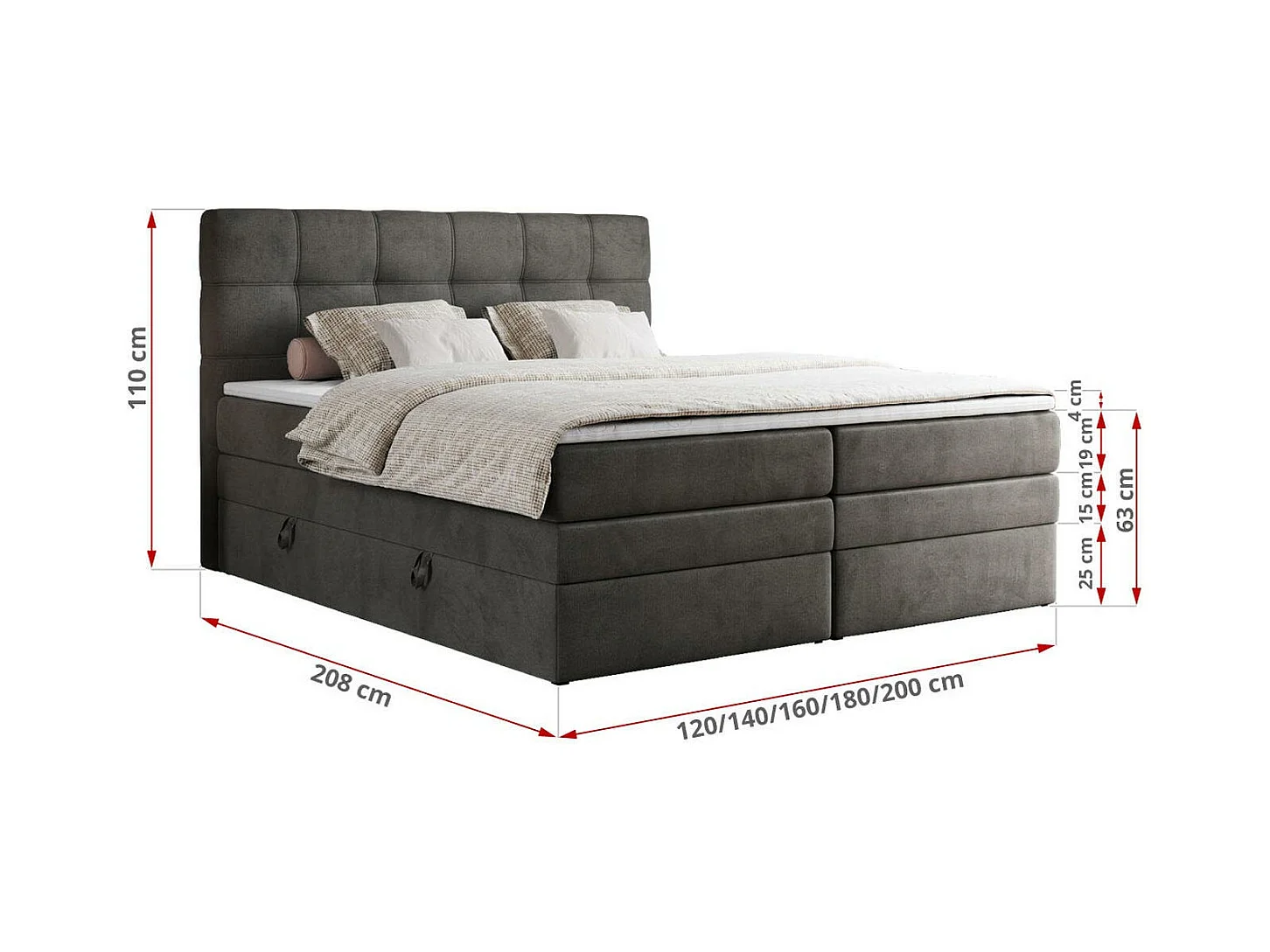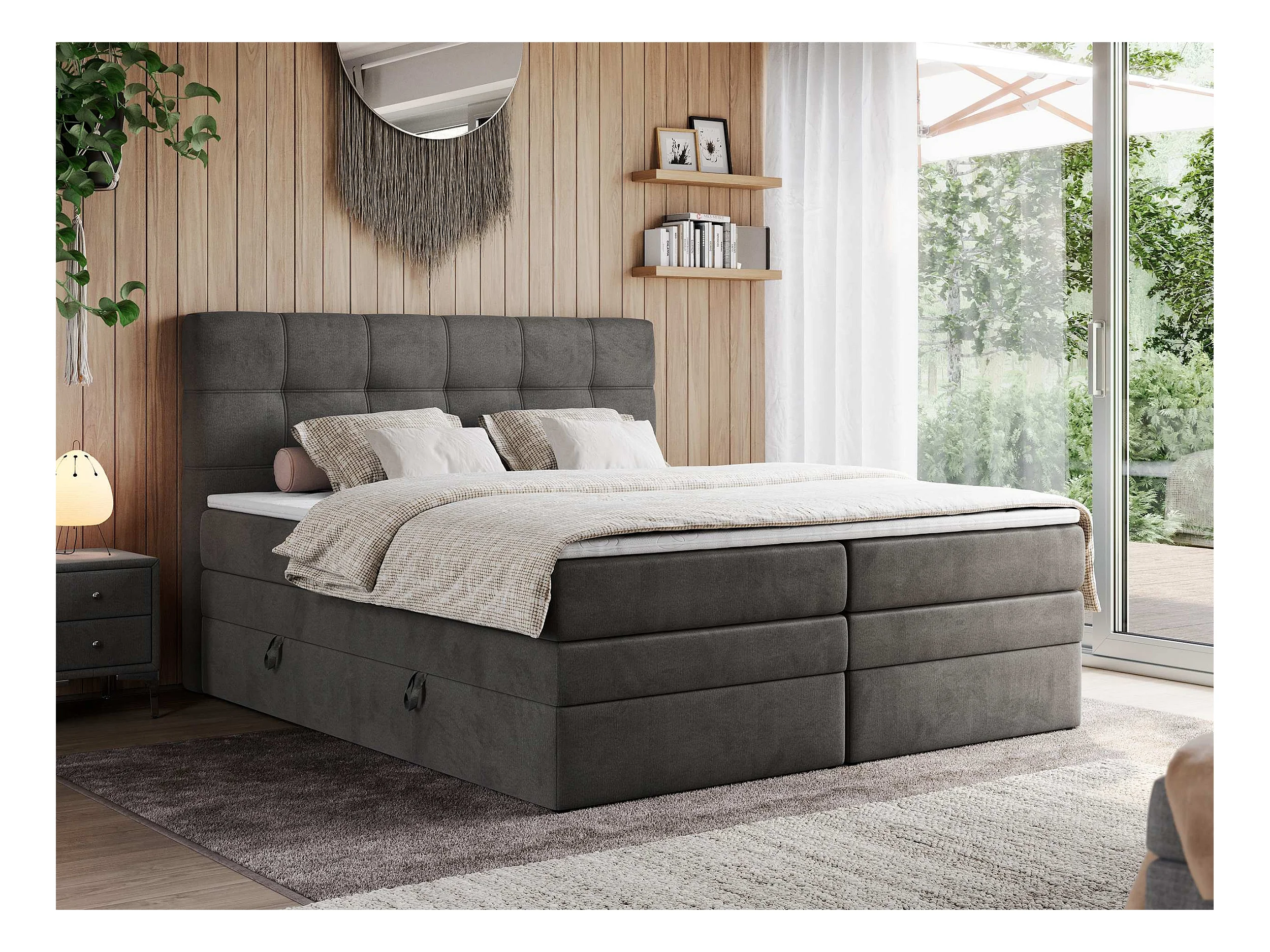 Boxspringbett ERNI KING, gestepptes Kopfteil, zwei Multipocket-Matratze und Topper, mit Stauraum - 140x200 cm - H4 - Dunkelgrau Velvet