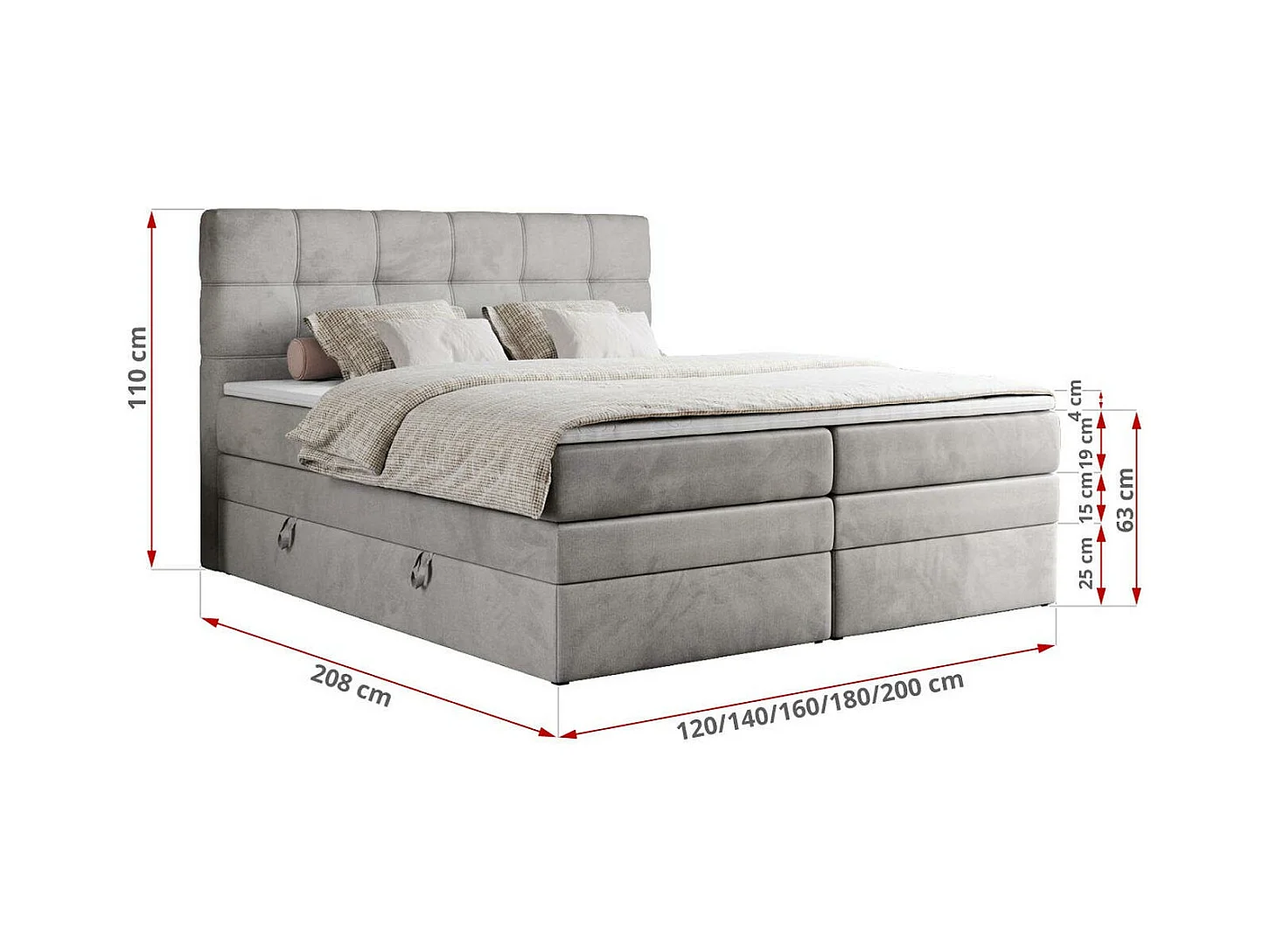 Boxspringbett ERNI KING, gestepptes Kopfteil, zwei Multipocket-Matratze und Topper, mit Stauraum - 160x200 cm - H3 - Hellgrau Velvet