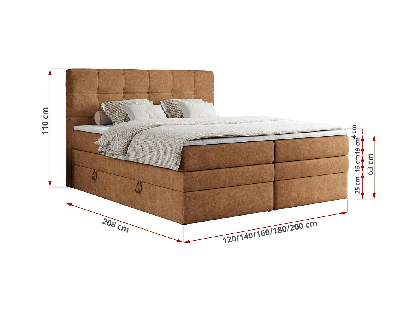 Boxspringbett ERNI KING, gestepptes Kopfteil, zwei Multipocket-Matratze und Topper, mit Stauraum - 160x200 cm - H4 - Orange Strukture
