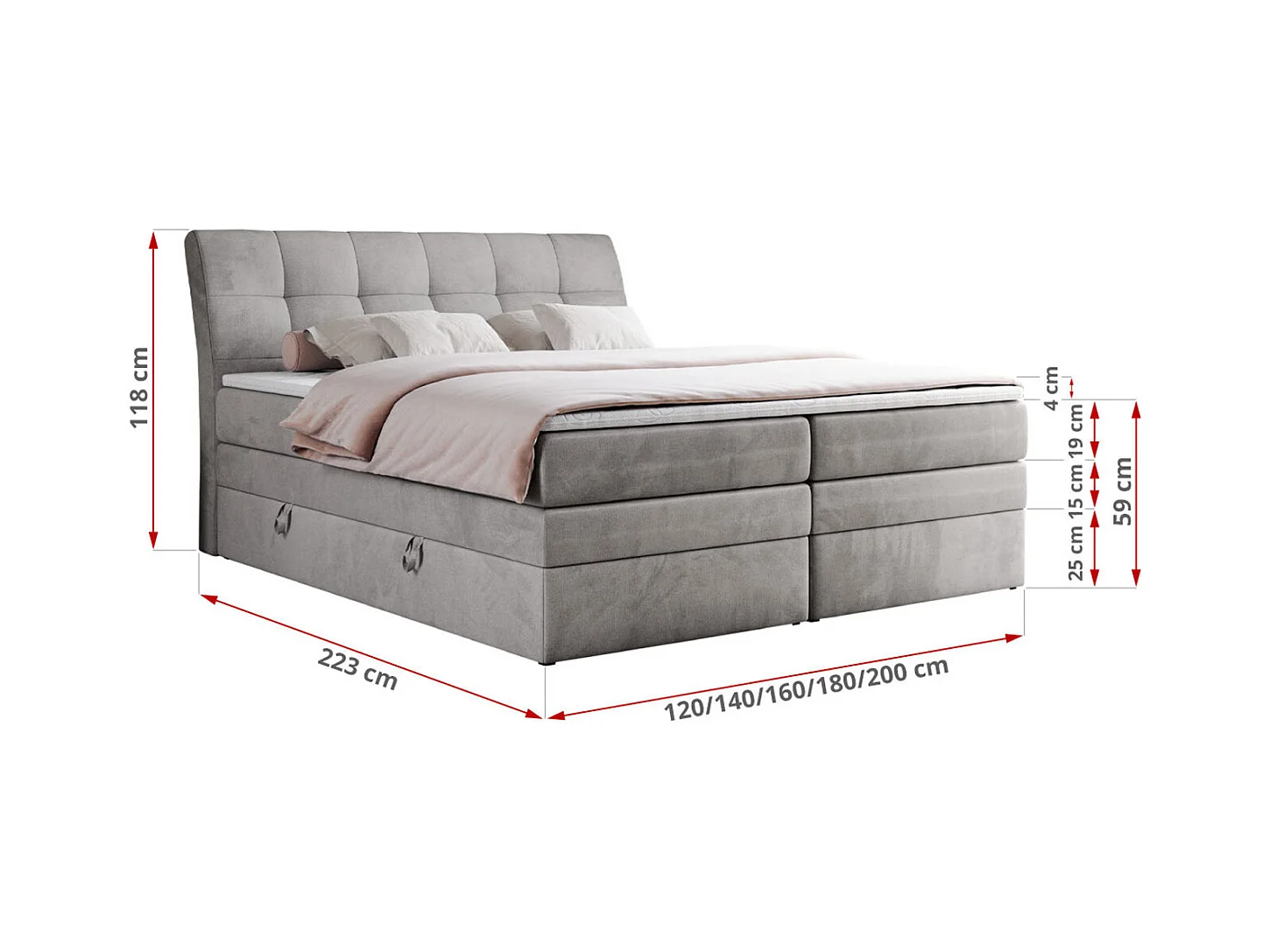Boxspringbett GOLD 10 KING mit genähtes Kopfteil und Stauraum, zwei Multipocket-Matratze - 120x200 cm - H3 - Hellgrau Velvet