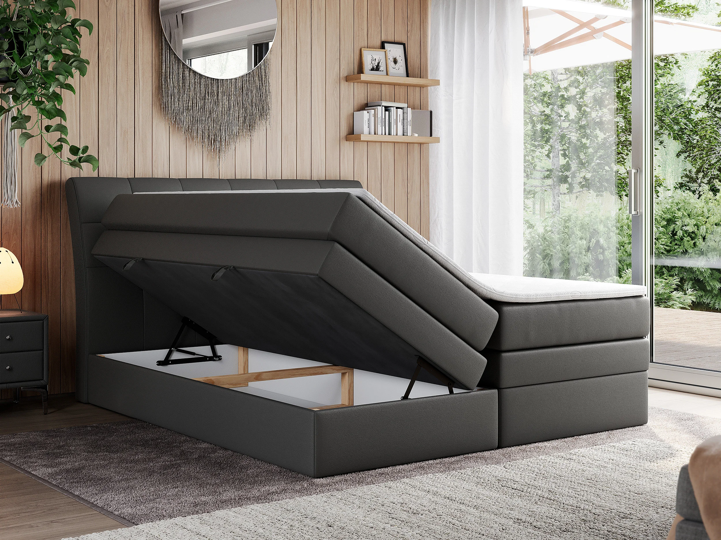 Boxspringbett GOLD 10 KING mit genähtes Kopfteil und Stauraum, zwei Multipocket-Matratze - 180x200 cm - H3 - Dunkelgrau Kunstleder