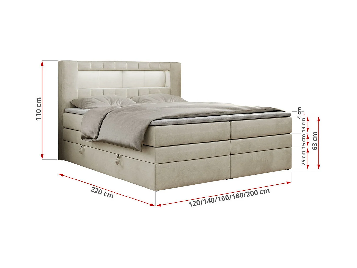 Boxspringbett GOLD 5 KING mit Stauraum, zwei Bettkästen, LED-Beleuchtung, Multipocket-Matratze - 120x200 cm - H3 - Beige Velvet