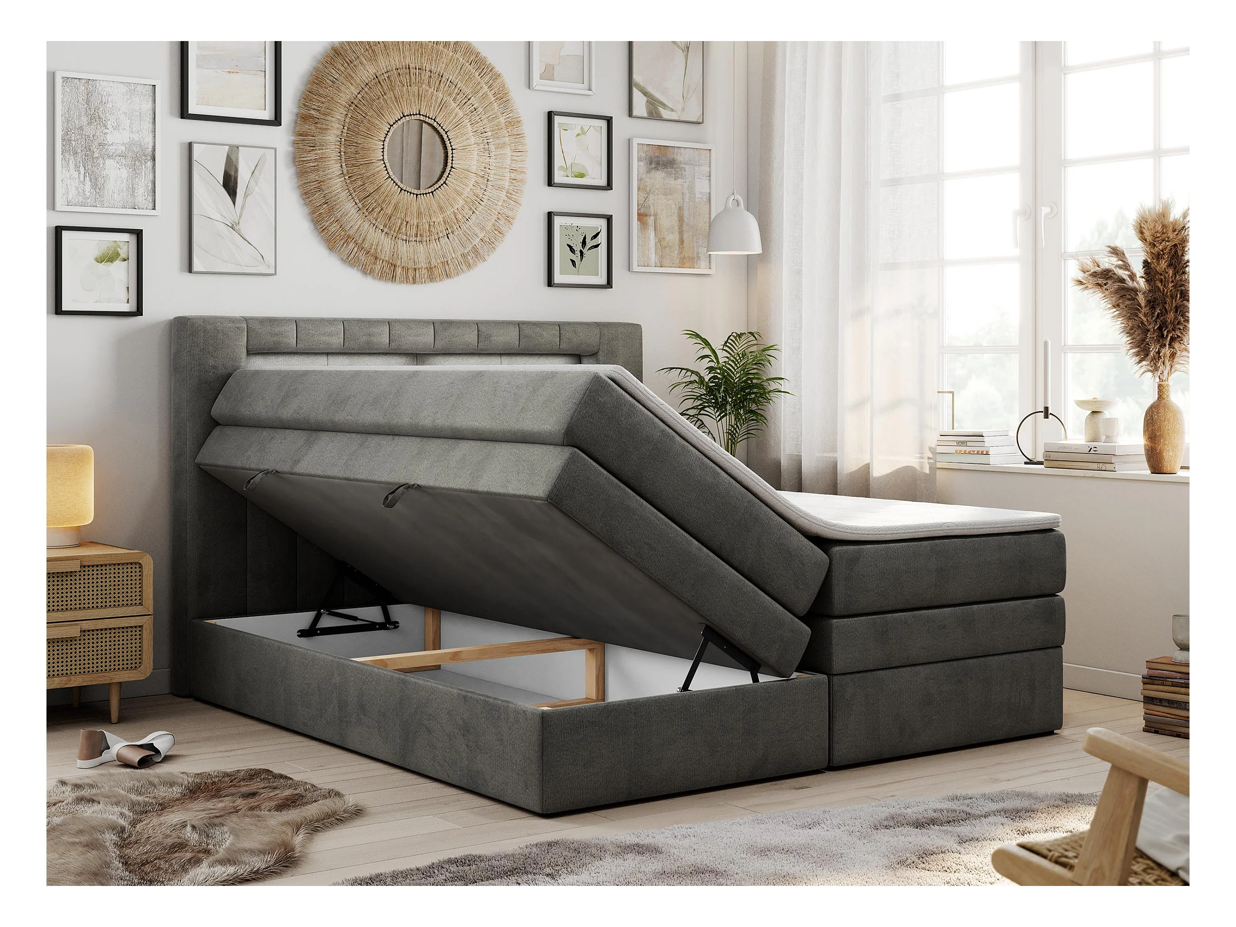 Boxspringbett GOLD 5 KING mit Stauraum, zwei Bettkästen, LED-Beleuchtung, Multipocket-Matratze - 120x200 cm - H3 - Dunkelgrau Velvet