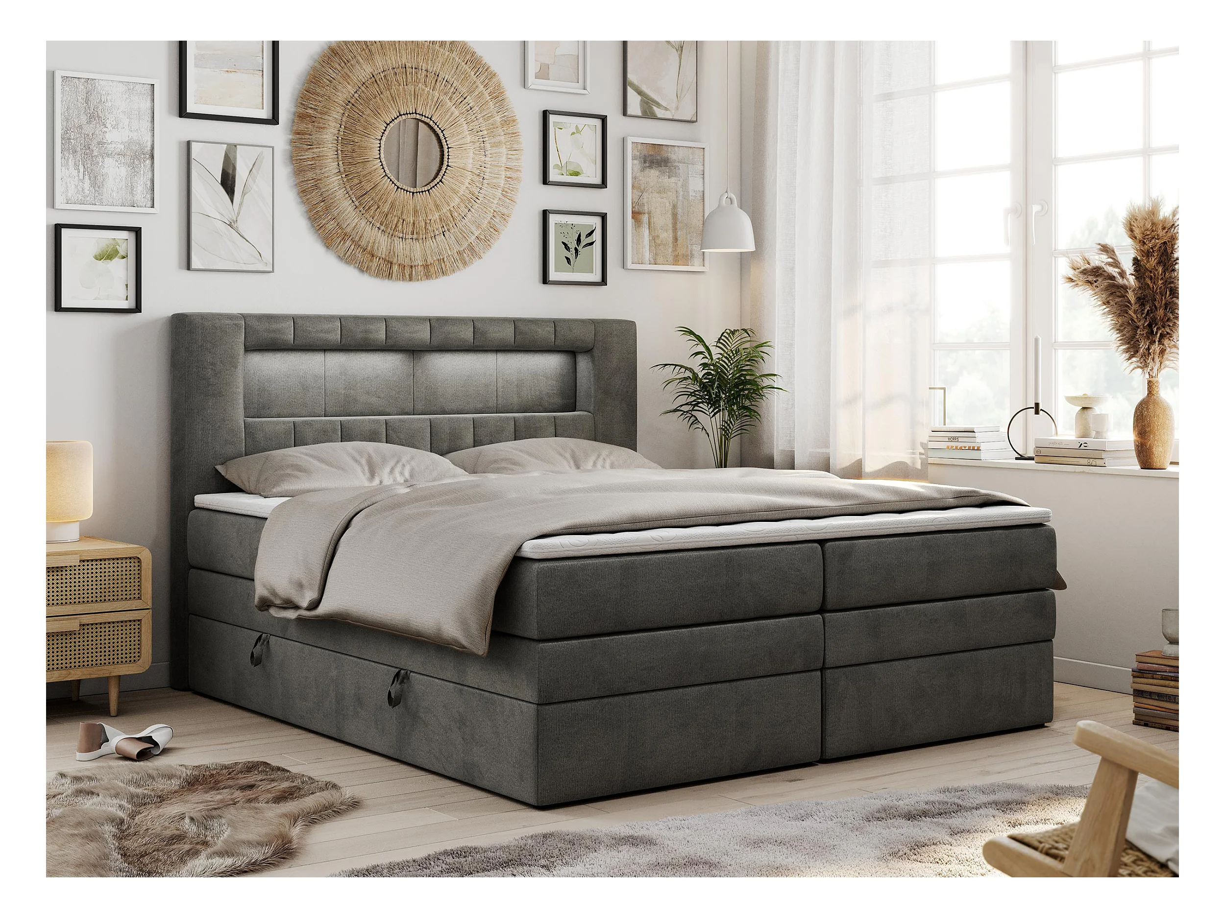 Boxspringbett GOLD 5 KING mit Stauraum, zwei Bettkästen, LED-Beleuchtung, Multipocket-Matratze - 120x200 cm - H4 - Dunkelgrau Velvet