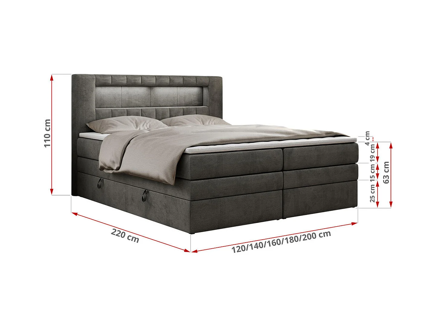 Boxspringbett GOLD 5 KING mit Stauraum, zwei Bettkästen, LED-Beleuchtung, Multipocket-Matratze - 160x200 cm - H3 - Dunkelgrau Velvet