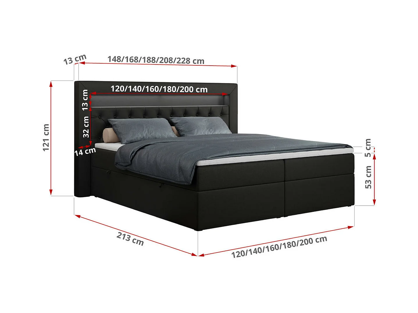 Boxspringbett GOLD 6, Doppelbett mit Stauraum, LED-Beleuchtung, gesteppte Kopfstütze - 120x200 cm - H3 - Schwarz Kunstleder