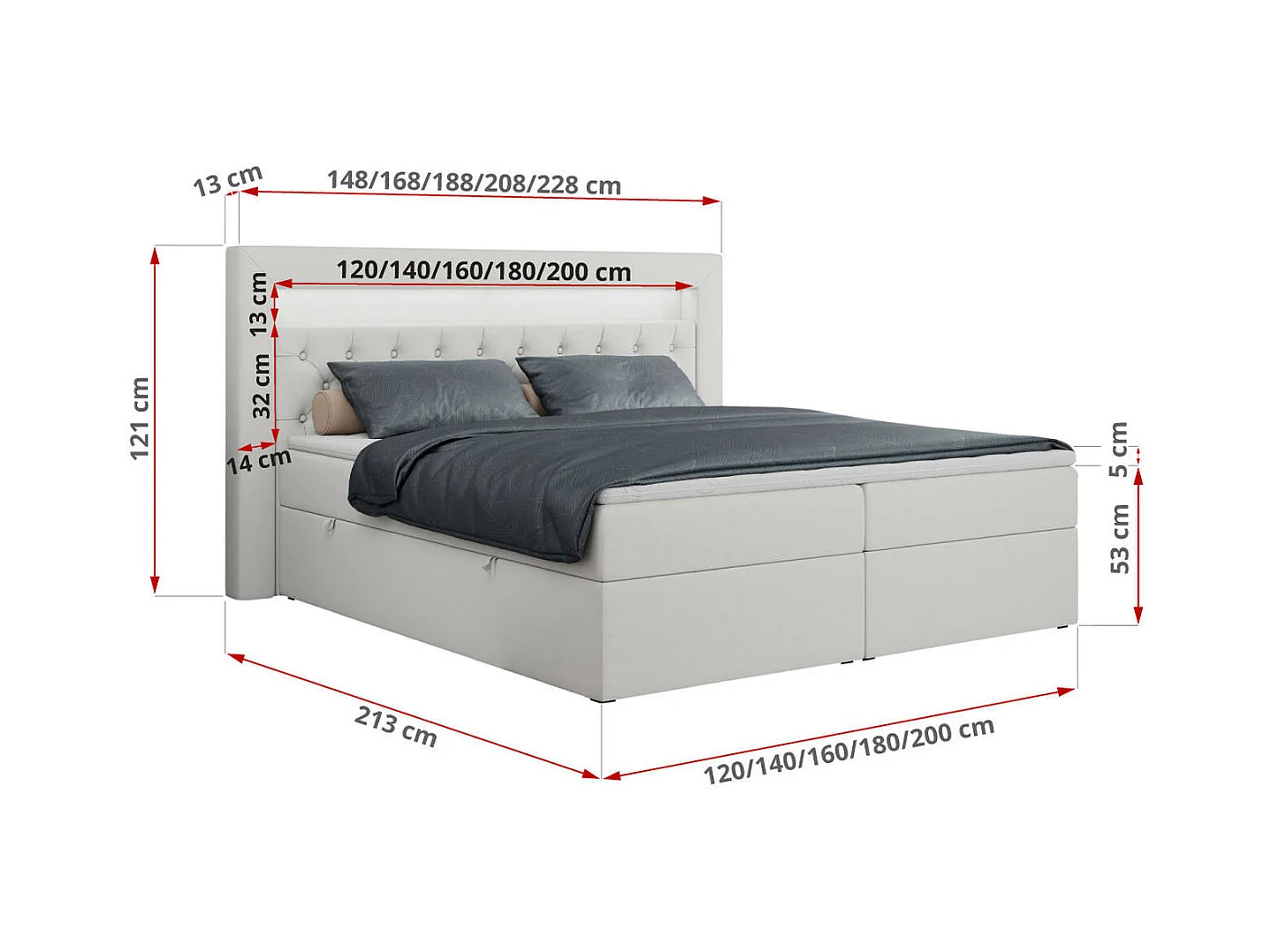 Boxspringbett GOLD 6, Doppelbett mit Stauraum, LED-Beleuchtung, gesteppte Kopfstütze - 120x200 cm - H3 - Weiß Kunstleder