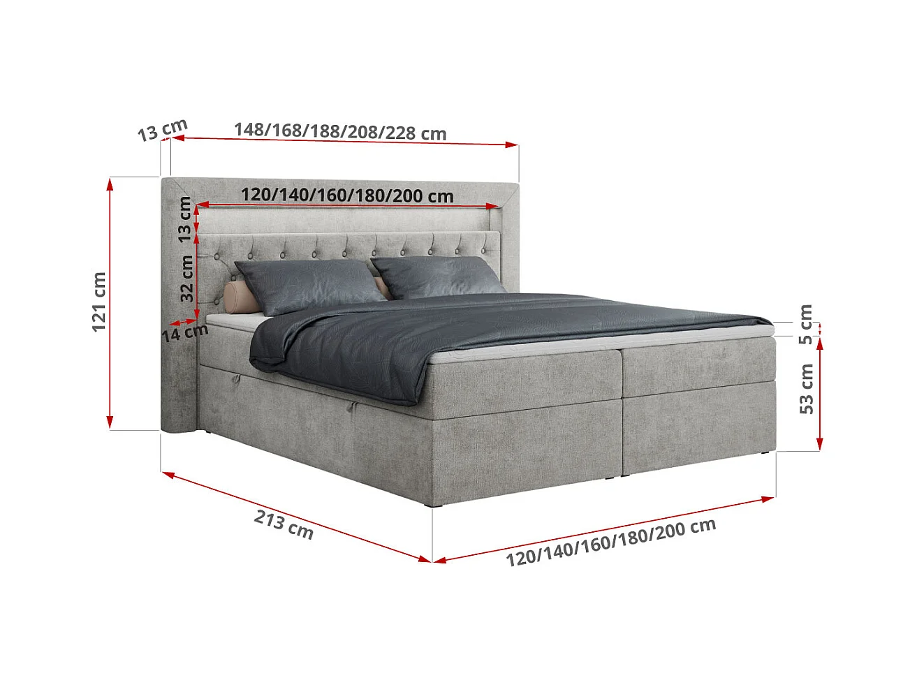 Boxspringbett GOLD 6, Doppelbett mit Stauraum, LED-Beleuchtung, gesteppte Kopfstütze - 120x200 cm - H4 - Hellgrau Strukture
