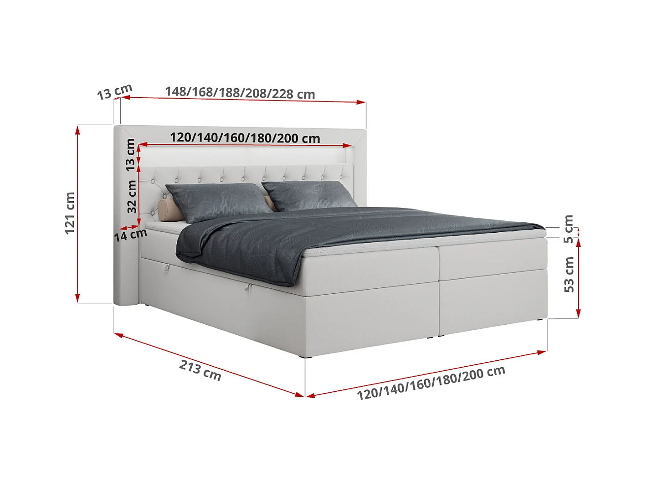 Boxspringbett GOLD 6, Doppelbett mit Stauraum, LED-Beleuchtung, gesteppte Kopfstütze - 140x200 cm - H3 - Weiß Kunstleder