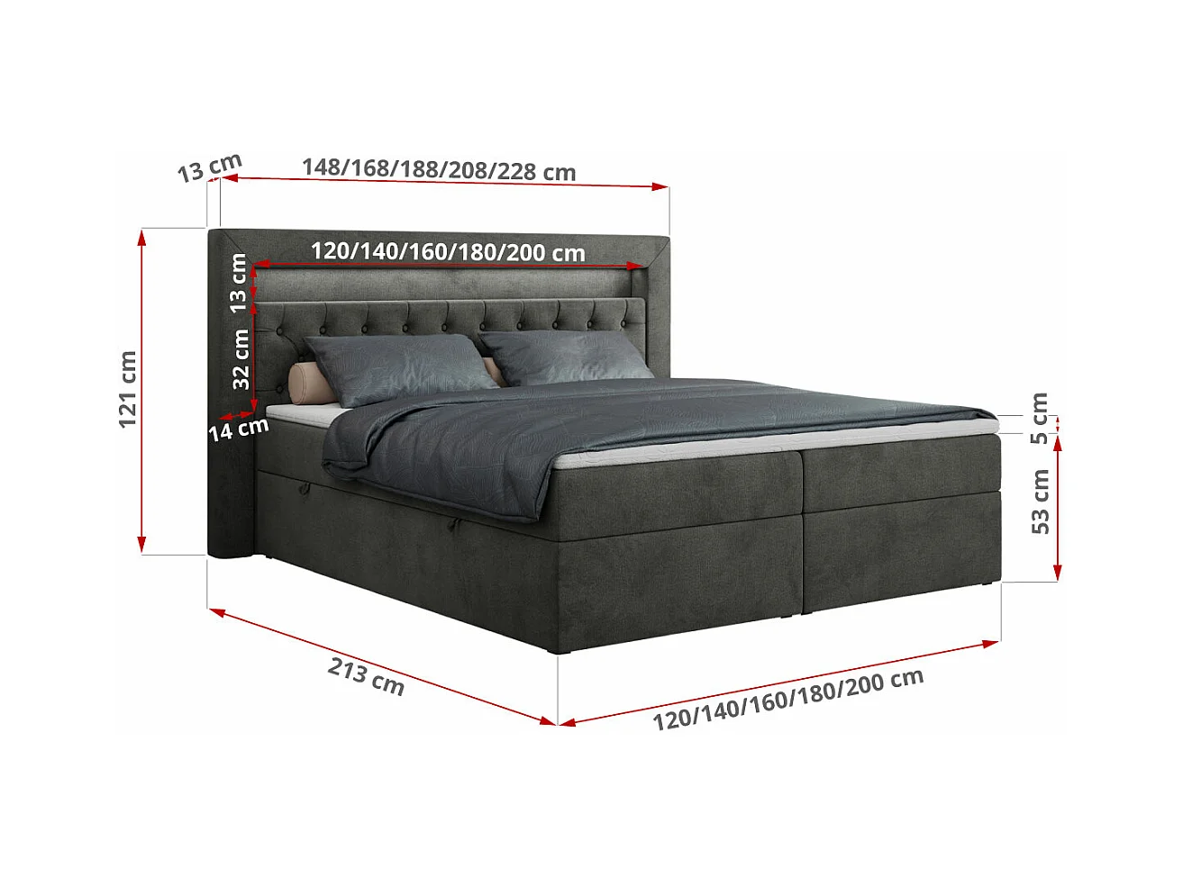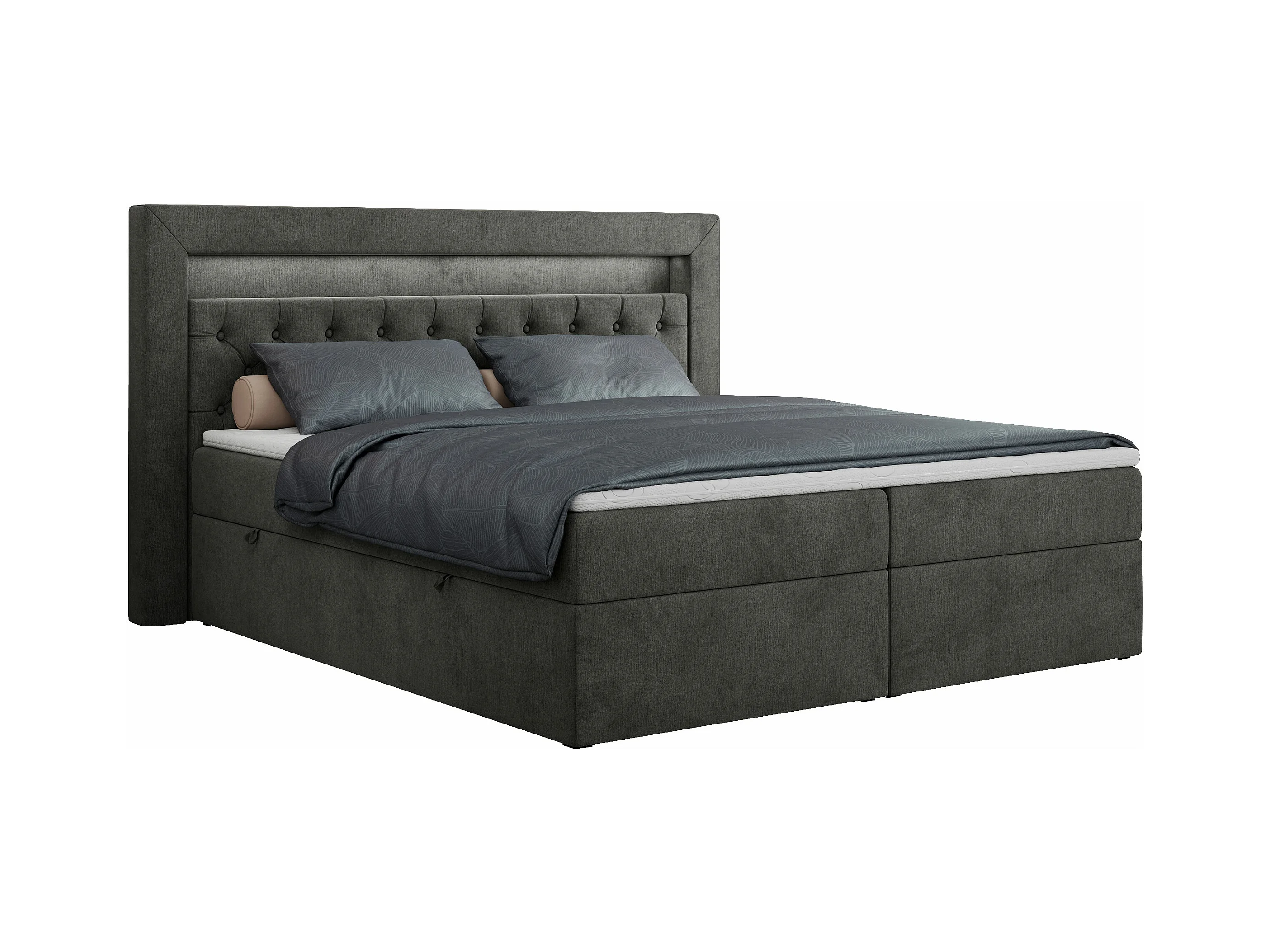 Boxspringbett GOLD 6, Doppelbett mit Stauraum, LED-Beleuchtung, gesteppte Kopfstütze - 160x200 cm - H3 - Dunkelgrau Velvet