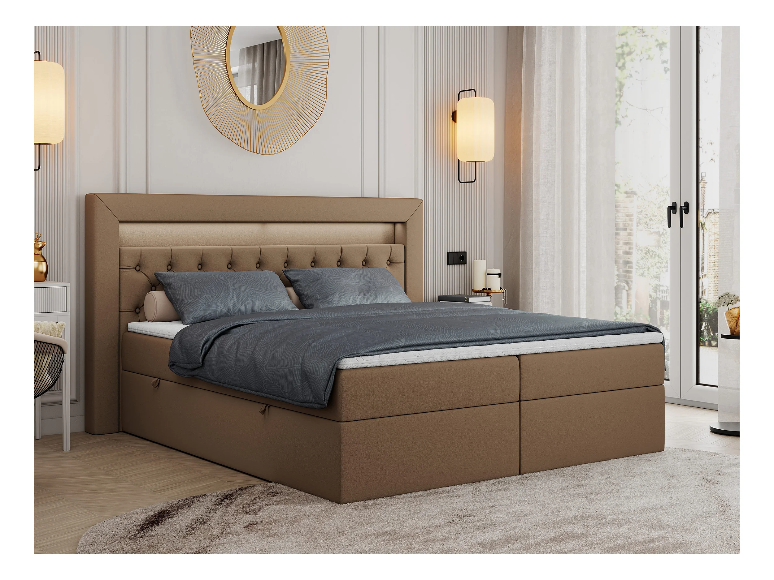 Boxspringbett GOLD 6, Doppelbett mit Stauraum, LED-Beleuchtung, gesteppte Kopfstütze - 160x200 cm - H4 - Braun Kunstleder