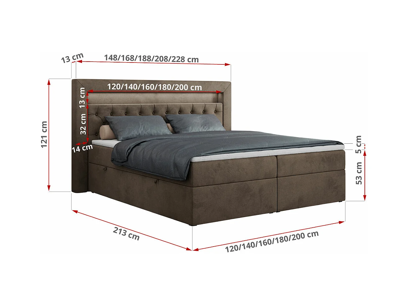 Boxspringbett GOLD 6, Doppelbett mit Stauraum, LED-Beleuchtung, gesteppte Kopfstütze - 180x200 cm - H4 - Braun Velvet