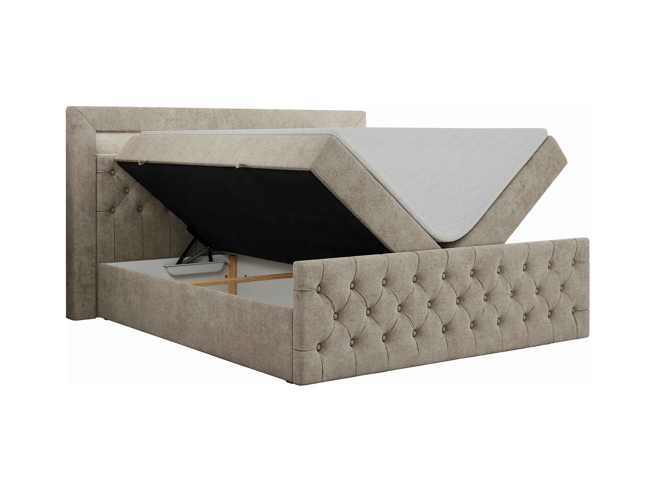 Boxspringbett GOLD 9 mit Stauraum, Multipocket-Matratze, gestepptes Bett, LED Beleuchtung - 140x200 cm - H3 - Beige Strukture