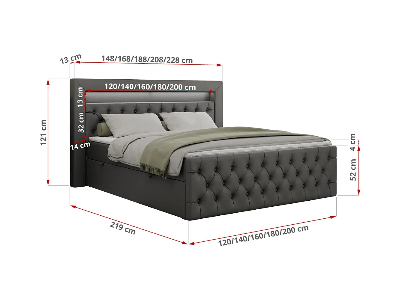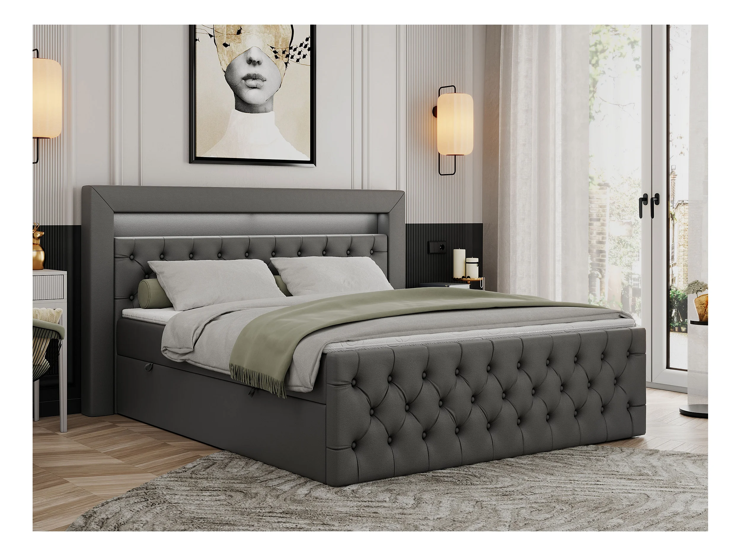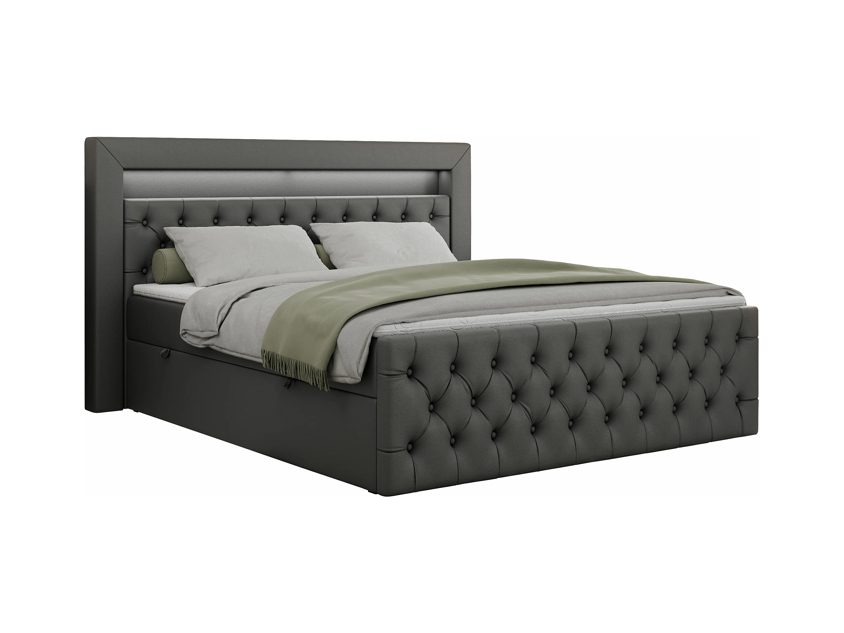 Boxspringbett GOLD 9 mit Stauraum, Multipocket-Matratze, gestepptes Bett, LED Beleuchtung - 140x200 cm - H3 - Dunkelgrau Kunstleder