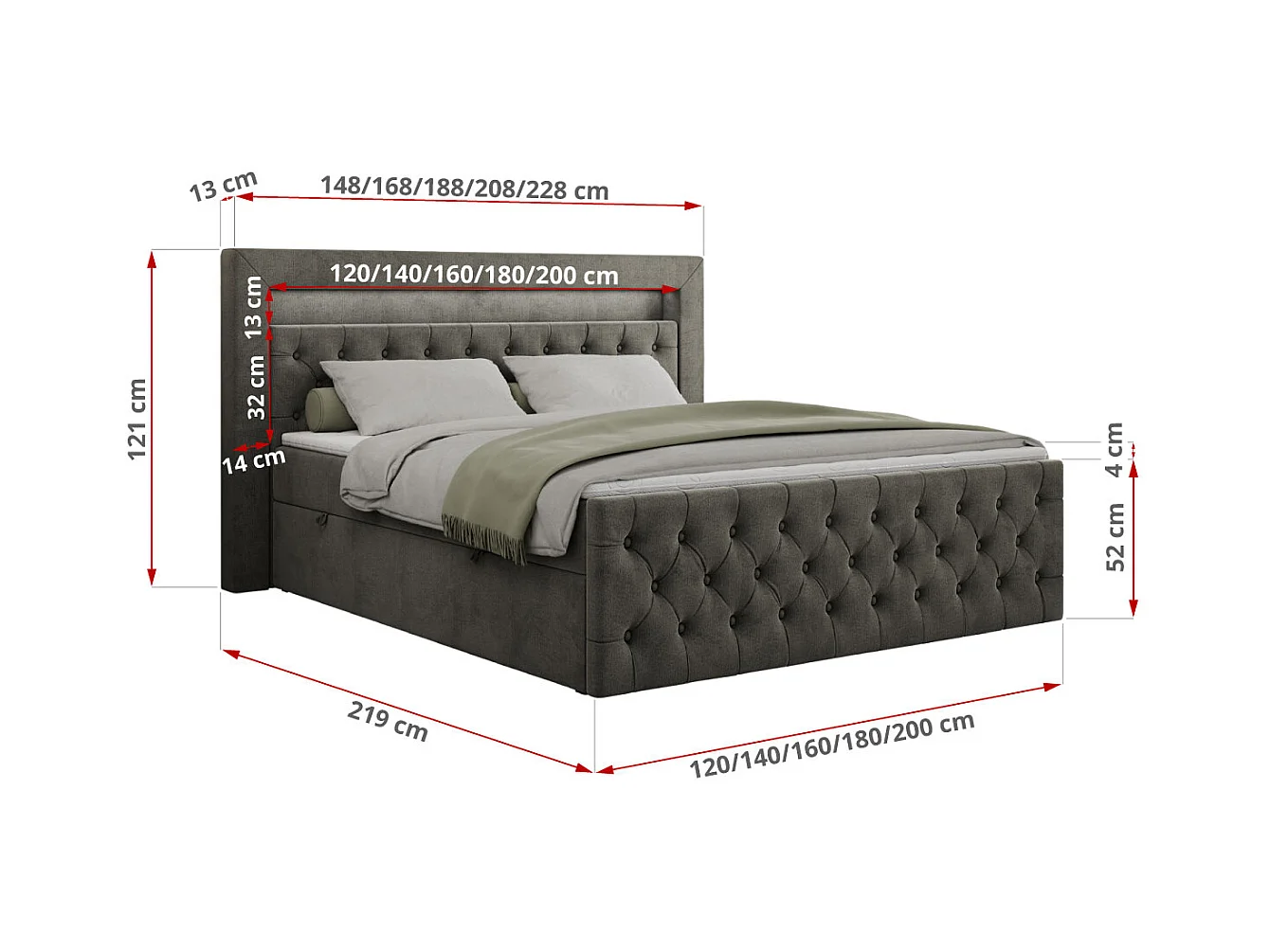Boxspringbett GOLD 9 mit Stauraum, Multipocket-Matratze, gestepptes Bett, LED Beleuchtung - 160x200 cm - H4 - Dunkelgrau Velvet