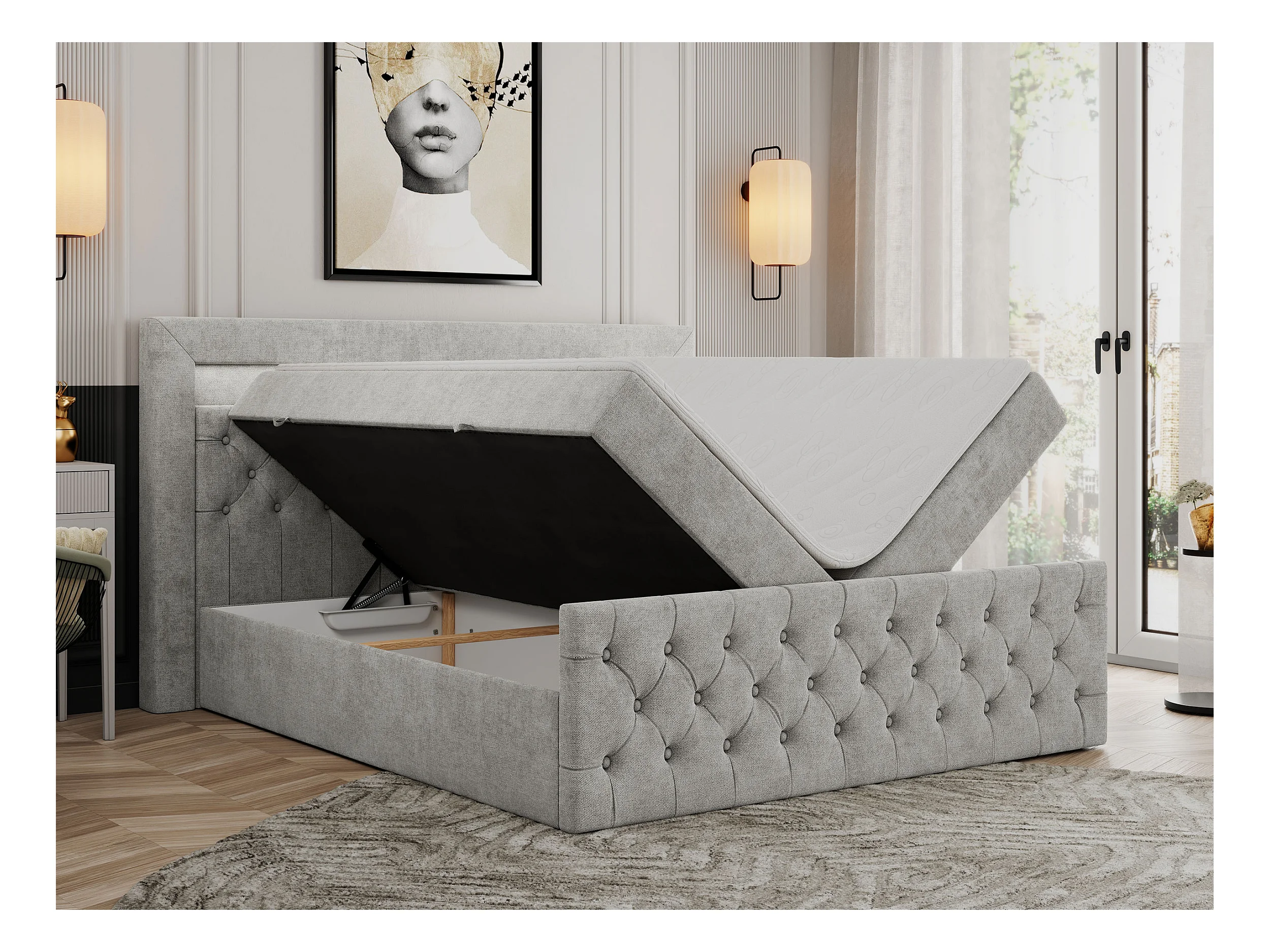Boxspringbett GOLD 9 mit Stauraum, Multipocket-Matratze, gestepptes Bett, LED Beleuchtung - 160x200 cm - H4 - Hellgrau Strukture