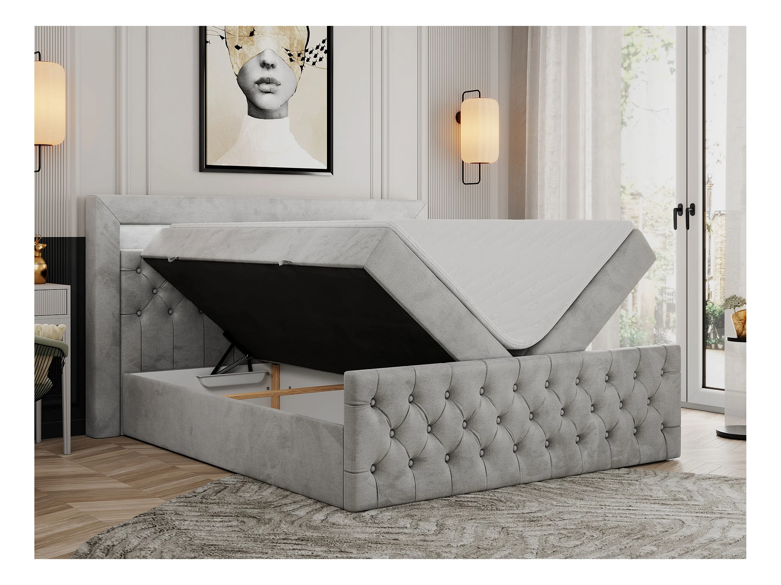 Boxspringbett GOLD 9 mit Stauraum, Multipocket-Matratze, gestepptes Bett, LED Beleuchtung - 180x200 cm - H3 - Hellgrau Velvet