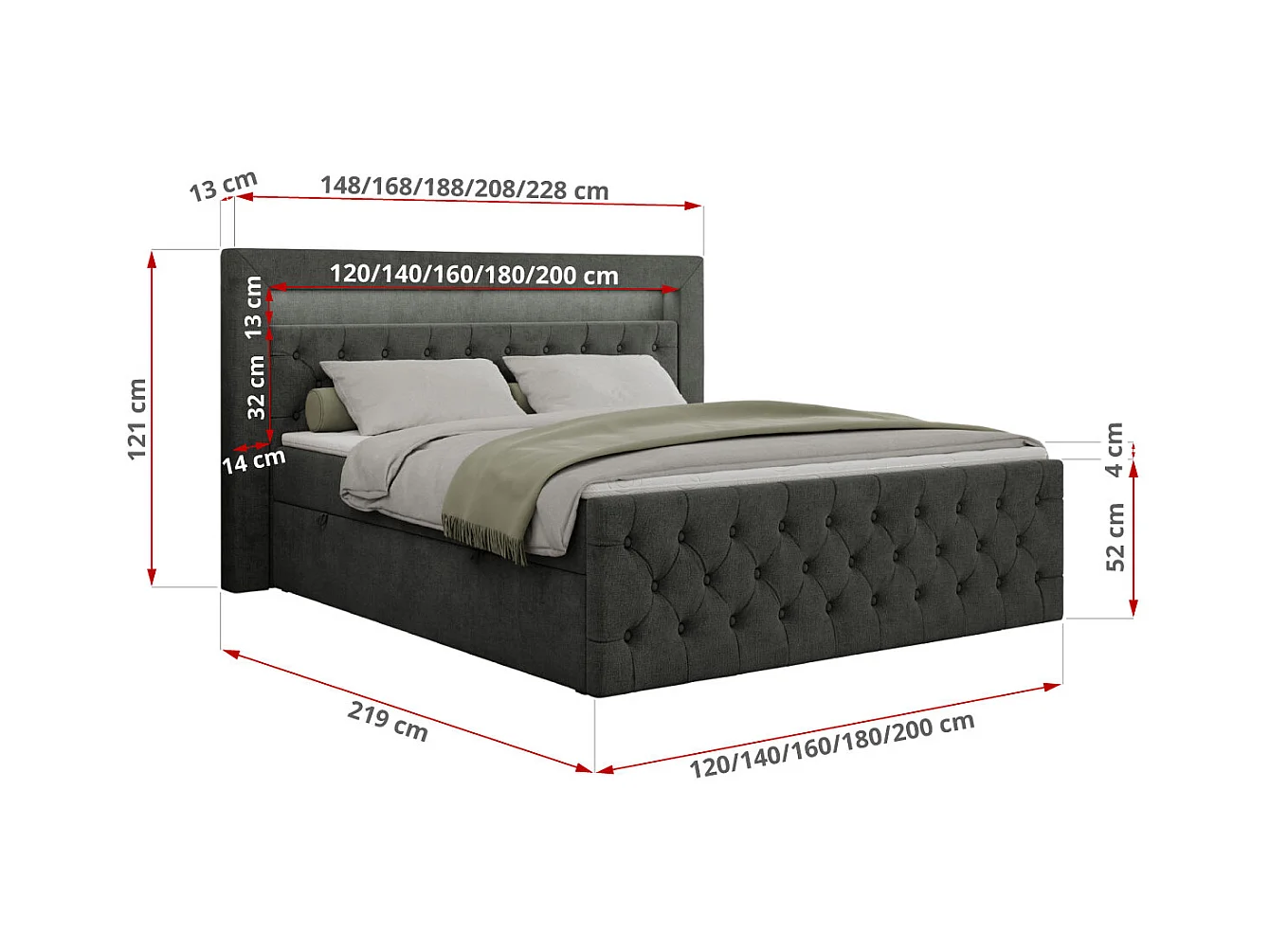Boxspringbett GOLD 9 mit Stauraum, Multipocket-Matratze, gestepptes Bett, LED Beleuchtung - 180x200 cm - H4 - Dunkelgrau Strukture
