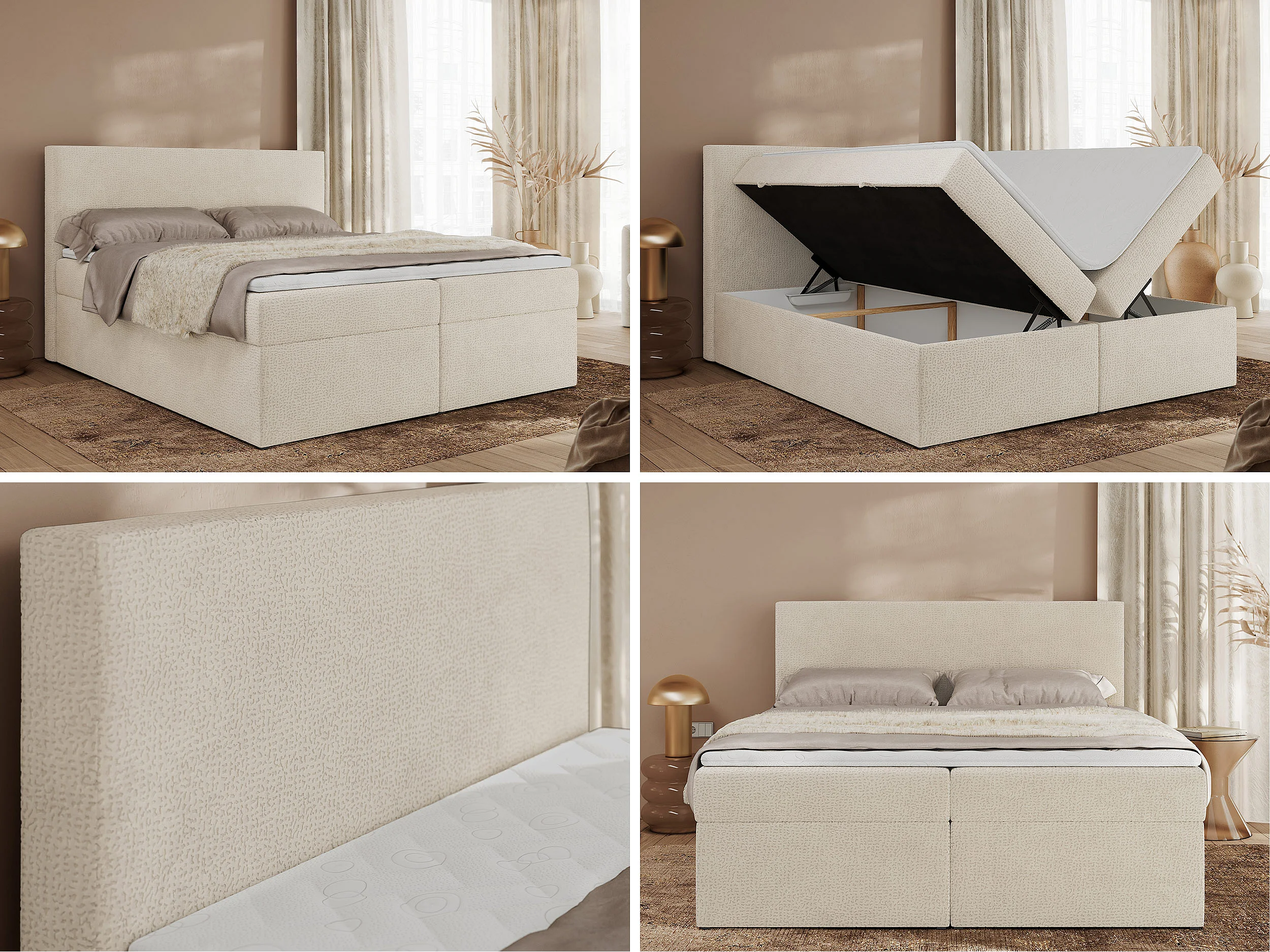 Boxspringbett JAGUAR - Doppelbett mit Multipocket-Matratze und Topper, Struktur dekostoff, zwei Bettkästen - 140x200 cm - H4 - Hellbeige Struktur