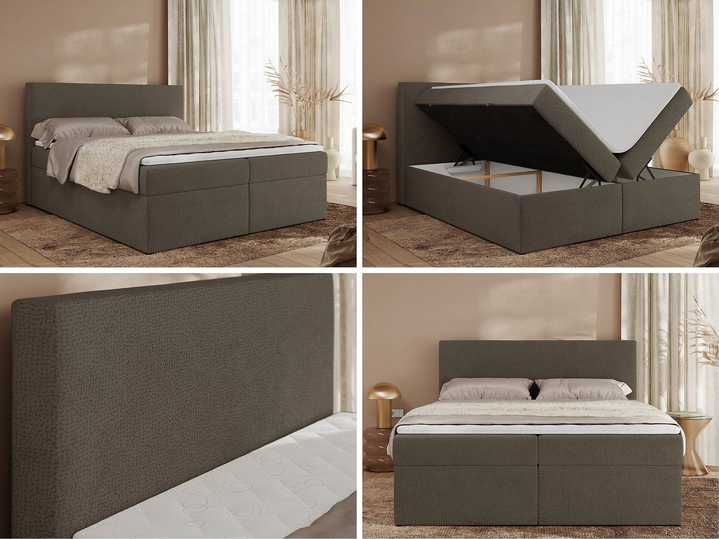 Boxspringbett JAGUAR - Doppelbett mit Multipocket-Matratze und Topper, Struktur dekostoff, zwei Bettkästen - 180x200 cm - H4 - Braun Struktur