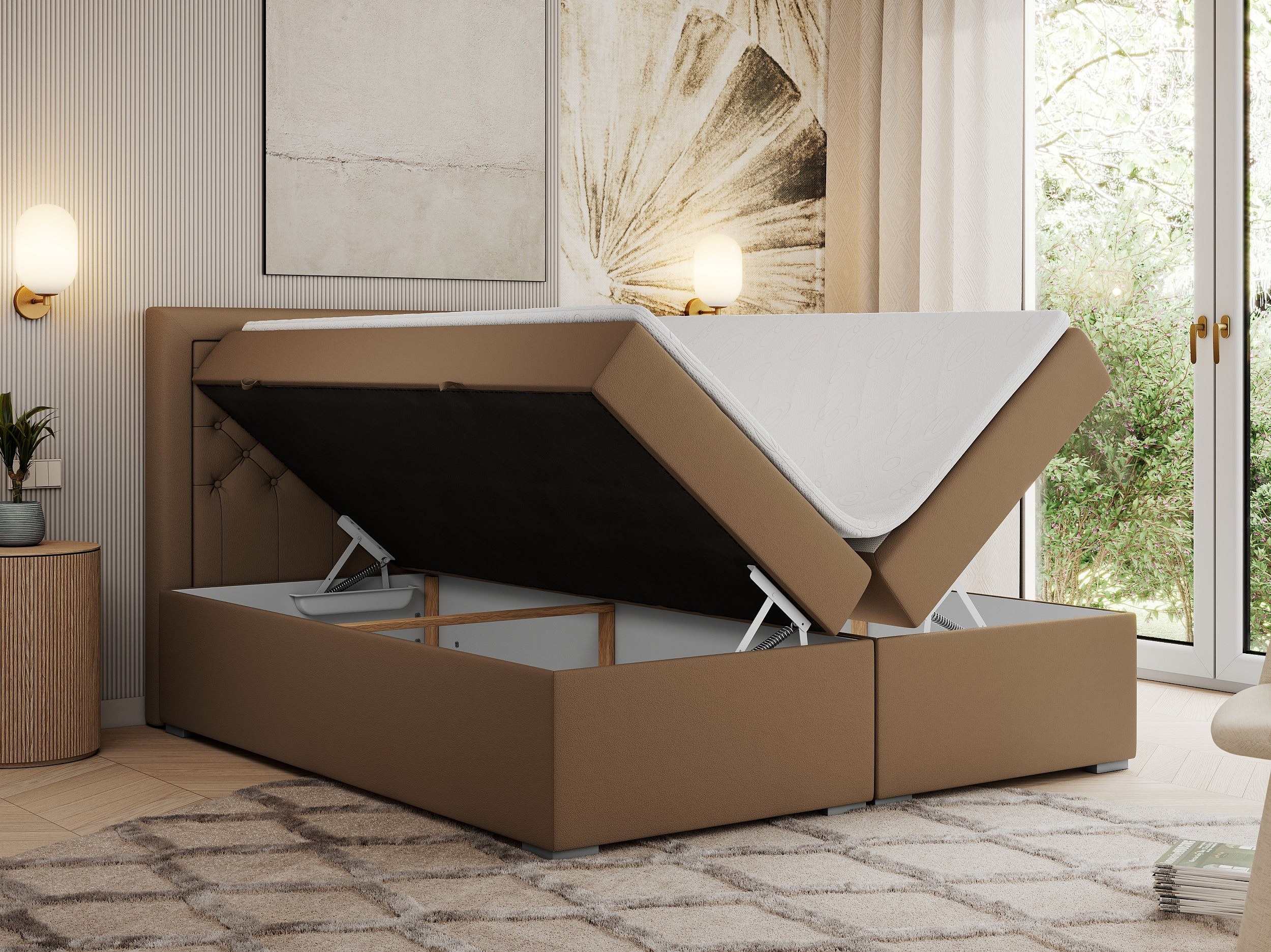 Boxspringbett JASIR - mit gestepptem Kopfteil, Doppelbett für Schlafzimmer, Multipocket-Matratze, Stauraum - 180x200 cm - H4 - Braun Kunstleder