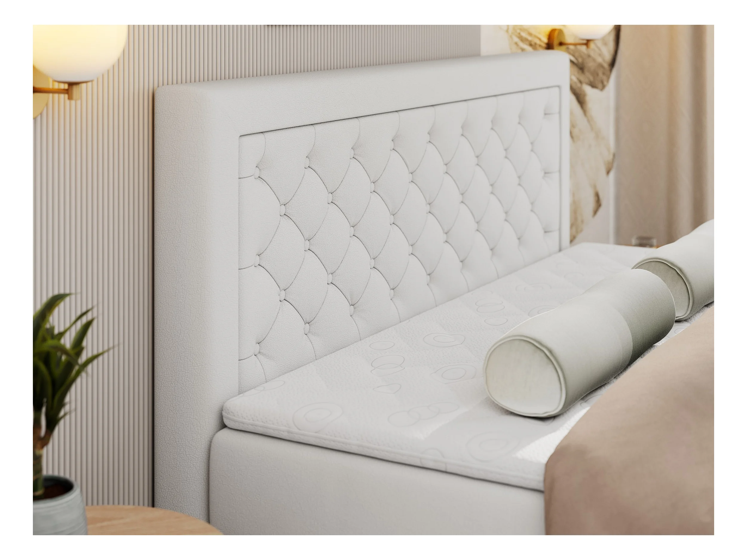Boxspringbett JASIR - mit gestepptem Kopfteil, Doppelbett für Schlafzimmer, Multipocket-Matratze, Stauraum - 180x200 cm - H4 - Weiß Kunstleder