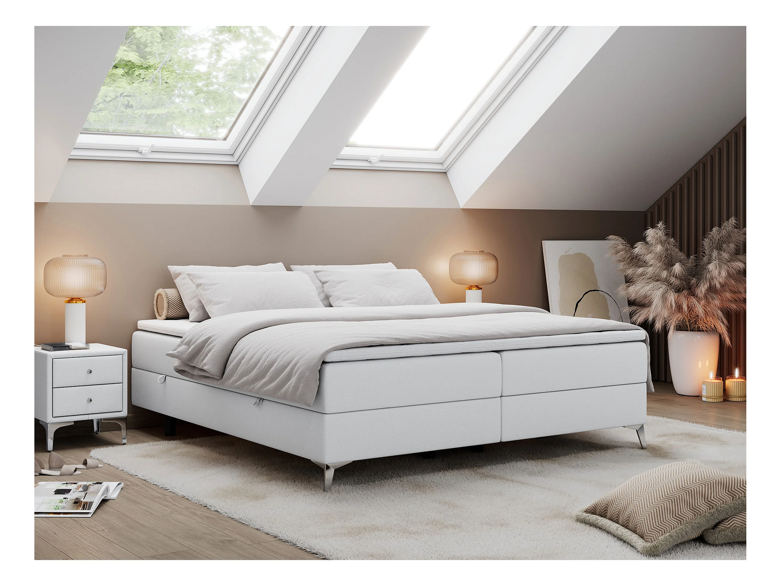 Boxspringbett LESS - Doppelbett mit zwei Bettkästen, 7 Härtezonen Multipocket-Matratzen, hohe Metallbeine - 160x200 cm - H4 - Weiß Kunstleder