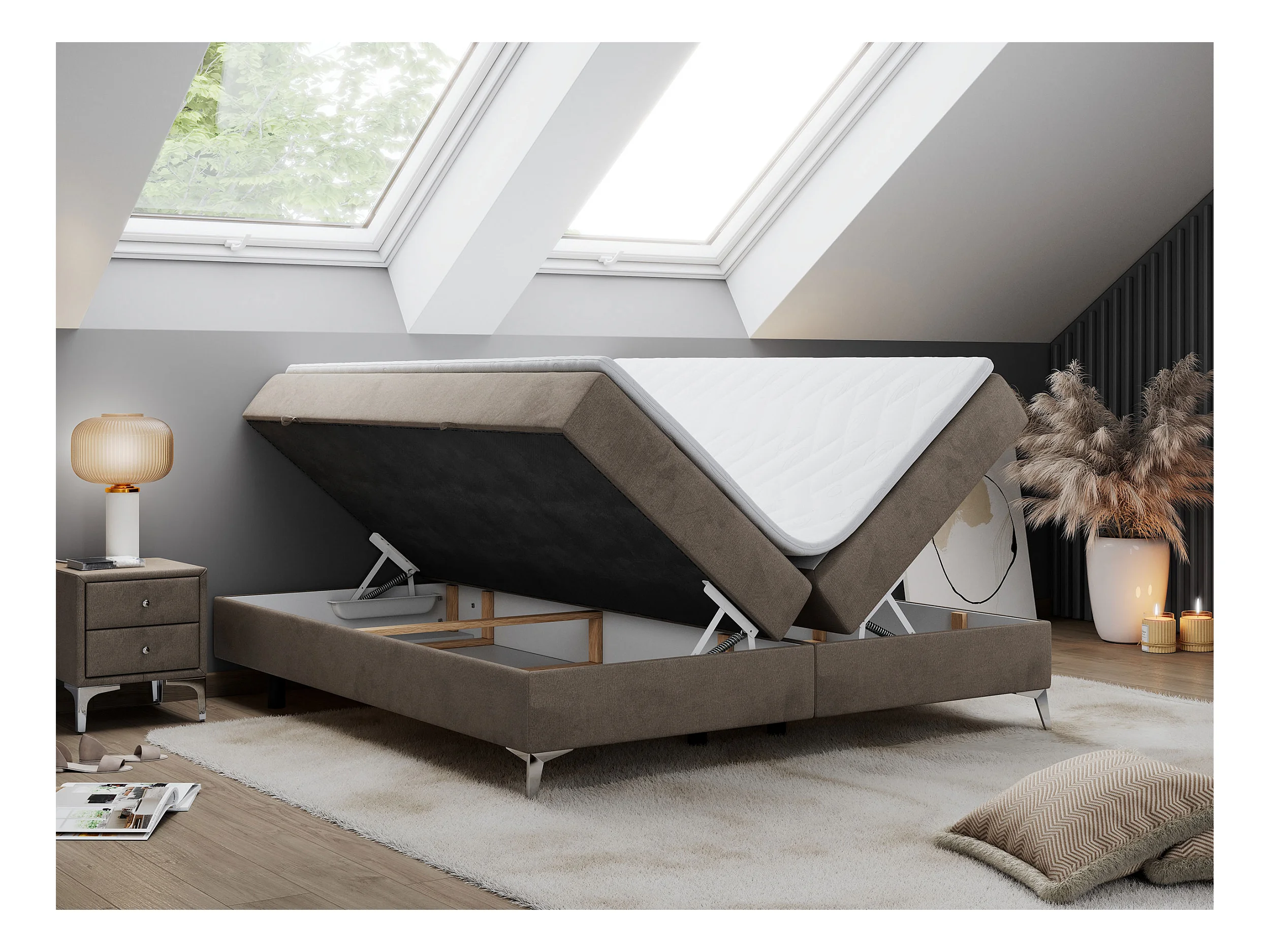 Boxspringbett LESS - Doppelbett mit zwei Bettkästen, 7 Härtezonen Multipocket-Matratzen, hohe Metallbeine - 200x200 cm - H4 - Braun Velvet