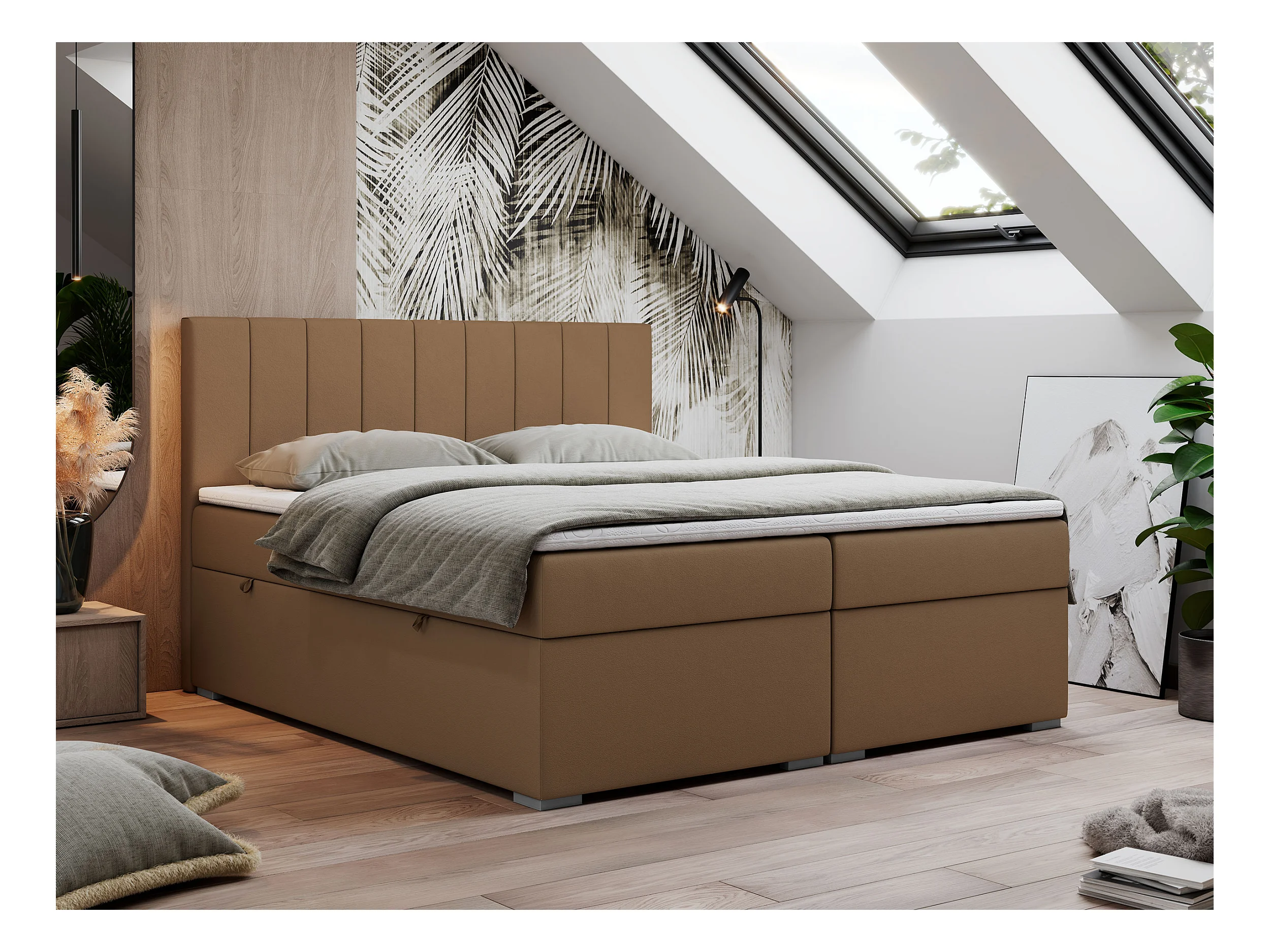 Boxspringbett LOPE - genähtes Kopfteil, Doppelbett mit Stauraum, Multipocket-Matratze, Topper - 120x200 cm - H4 - Braun Kunstleder